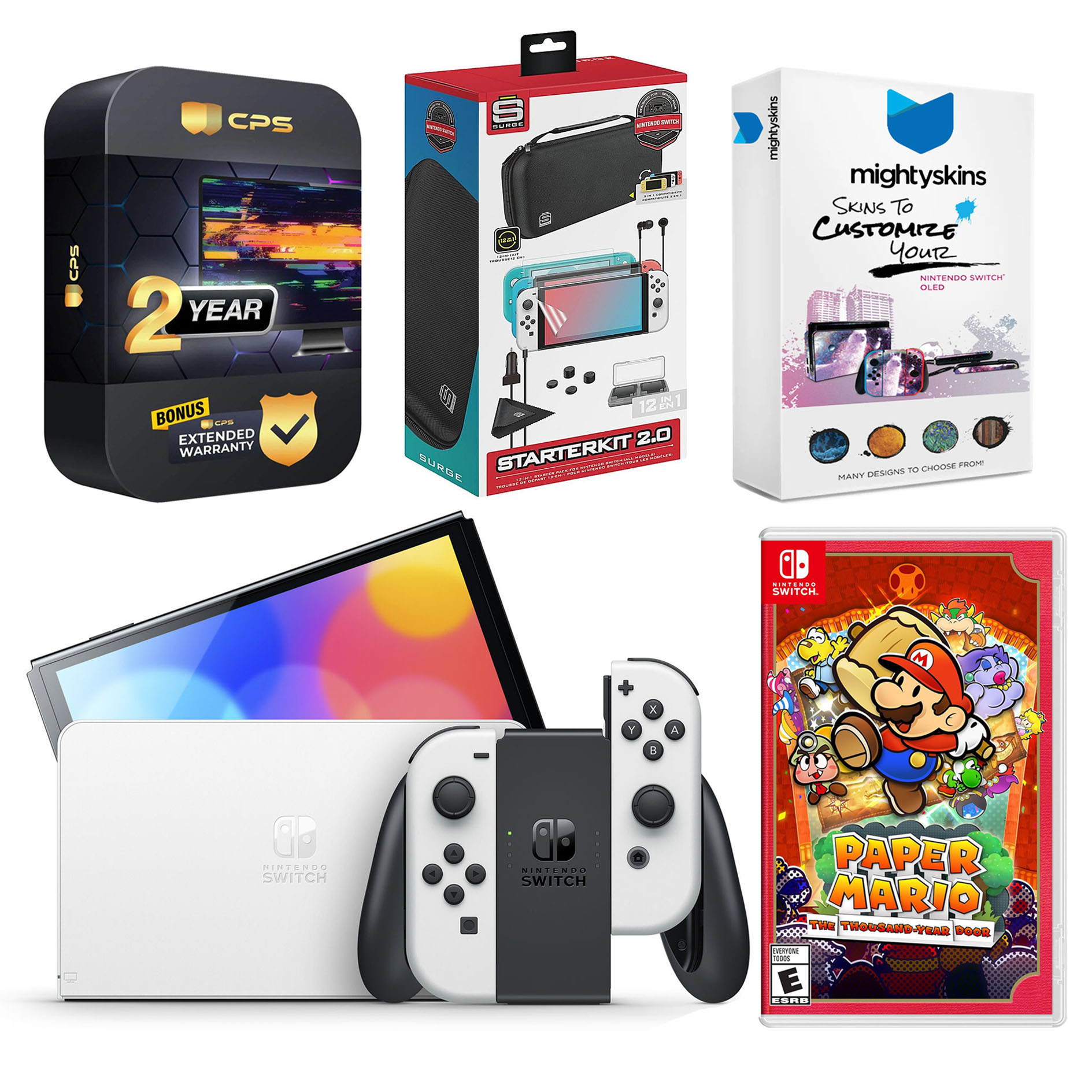 INCLUDED: Nintendo Switch OLED Console, Nintendo Switch OLED Dock, Left & Right Joy-Cons, Joy-Con Wrist Straps, Joy-Con Grip, High speed HDMI Cable, Nintendo Switch AC Adapter, Paper Mario: the Thousand Year Door game, Surge Accessory Gaming Kit, MightySkins Voucher, and 2 Year CPS Extended Warranty.