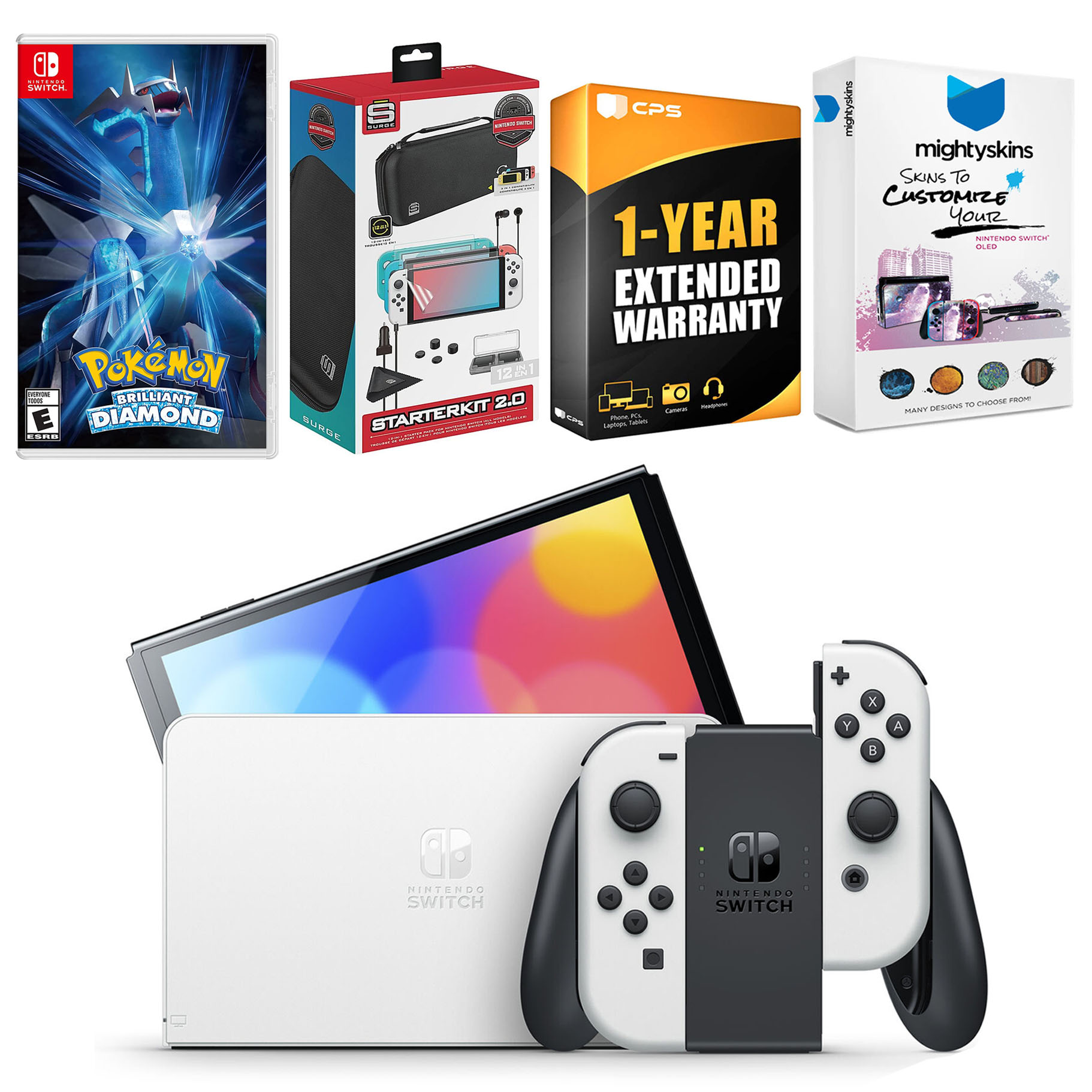 INCLUDED: Nintendo Switch OLED Console, Nintendo Switch OLED Dock, Left & Right Joy-Cons, Joy-Con Wrist Straps, Joy-Con Grip, High speed HDMI Cable, Nintendo Switch AC Adapter, Pokemon Brilliant Diamond game, Surge Accessory Gaming Kit, MightySkins Voucher, and 1 Year CPS Extended Warranty.
