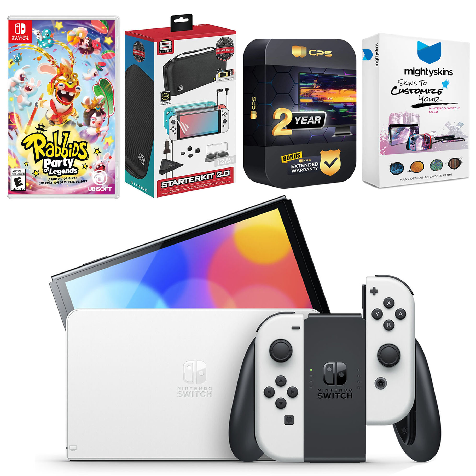 INCLUDED: Nintendo Switch OLED Console, Nintendo Switch OLED Dock, Left & Right Joy-Cons, Joy-Con Wrist Straps, Joy-Con Grip, High speed HDMI Cable, Nintendo Switch AC Adapter, Rabbids: Party of Legends game, Surge Accessory Gaming Kit, MightySkins Voucher, and 2 Year CPS Extended Warranty.