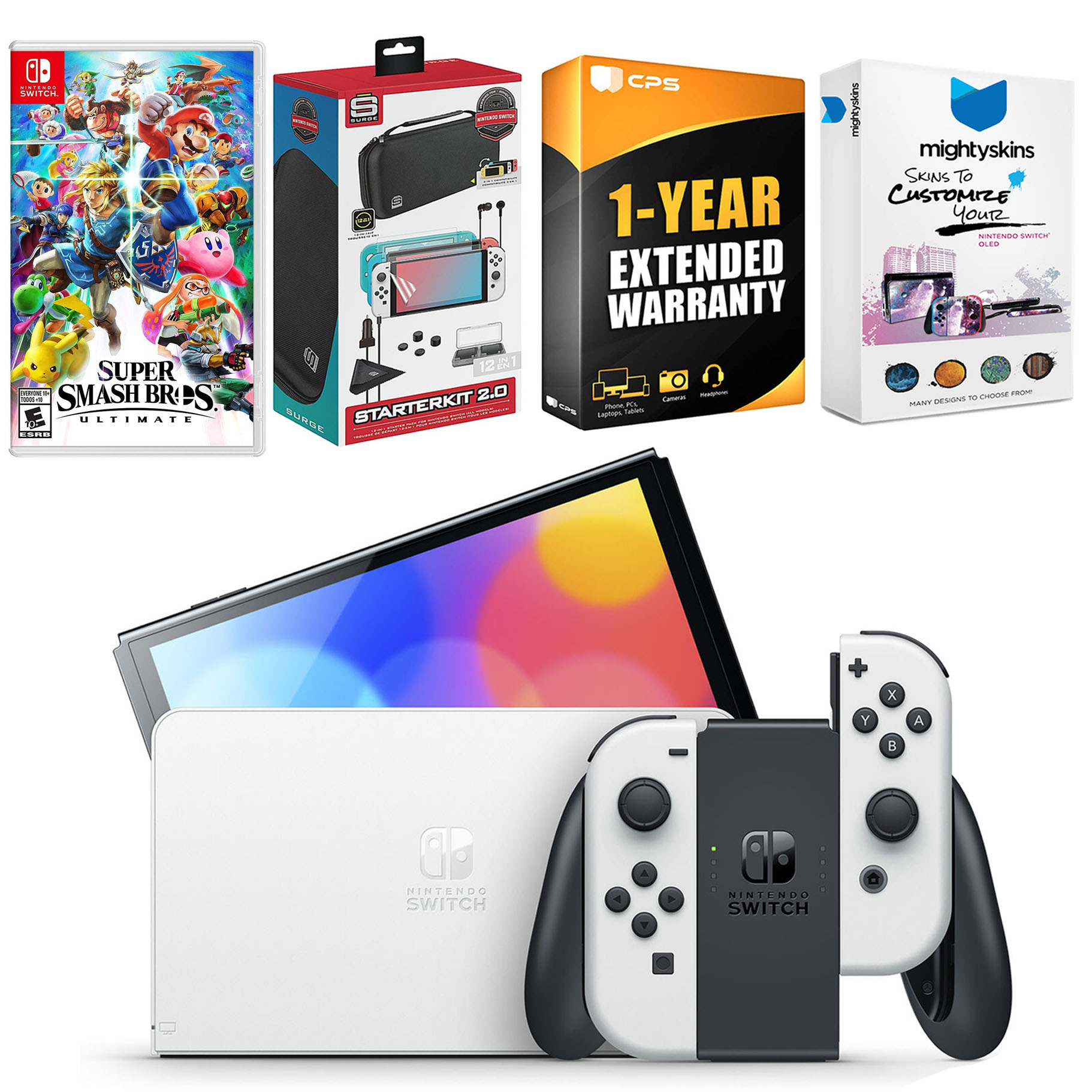 INCLUDED: Nintendo Switch OLED Console, Nintendo Switch OLED Dock, Left & Right Joy-Cons, Joy-Con Wrist Straps, Joy-Con Grip, High speed HDMI Cable, Nintendo Switch AC Adapter, Super Smash Bros: Ultimate game, Surge Accessory Gaming Kit, MightySkins Voucher, and 1 Year CPS Extended Warranty.