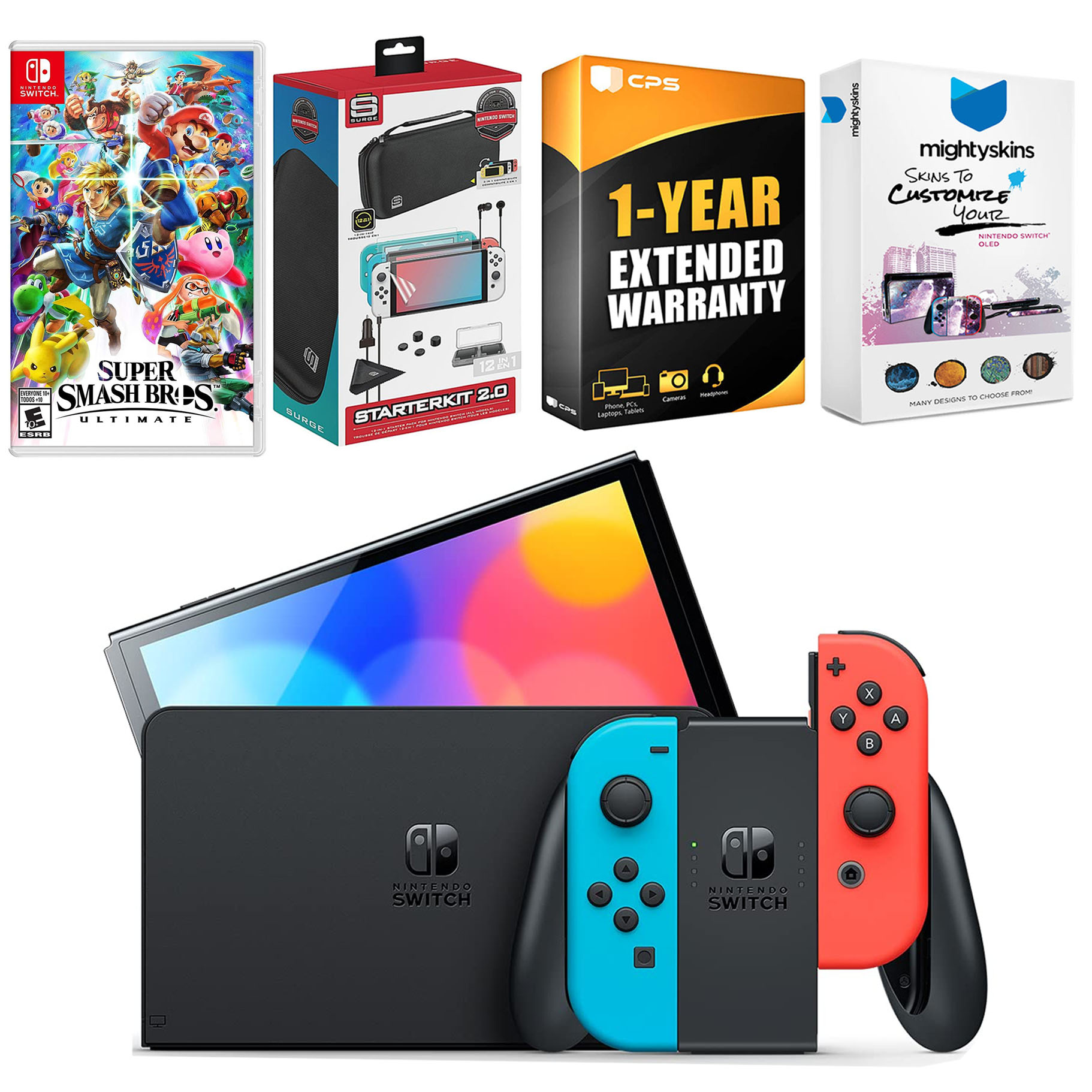 INCLUDED: Nintendo Switch OLED Console, Nintendo Switch OLED Dock, Left & Right Joy-Cons, Joy-Con Wrist Straps, Joy-Con Grip, High speed HDMI Cable, Nintendo Switch AC Adapter, Super Smash Bros: Ultimate game, Surge Accessory Gaming Kit, MightySkins Voucher, and 1 Year CPS Extended Warranty.