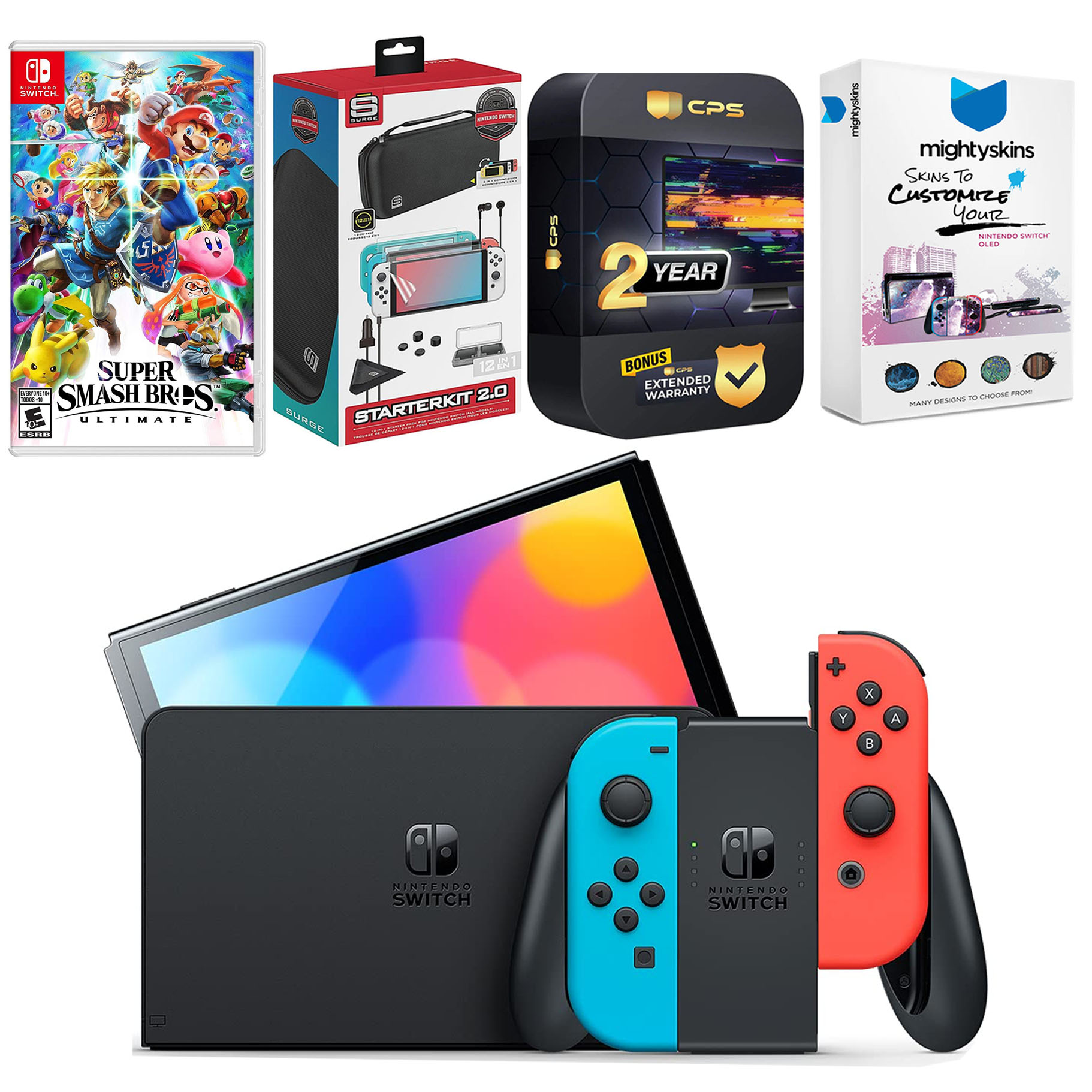 INCLUDED: Nintendo Switch OLED Console, Nintendo Switch OLED Dock, Left & Right Joy-Cons, Joy-Con Wrist Straps, Joy-Con Grip, High speed HDMI Cable, Nintendo Switch AC Adapter, Super Smash Bros: Ultimate game, Surge Accessory Gaming Kit, MightySkins Voucher, and 2 Year CPS Extended Warranty.