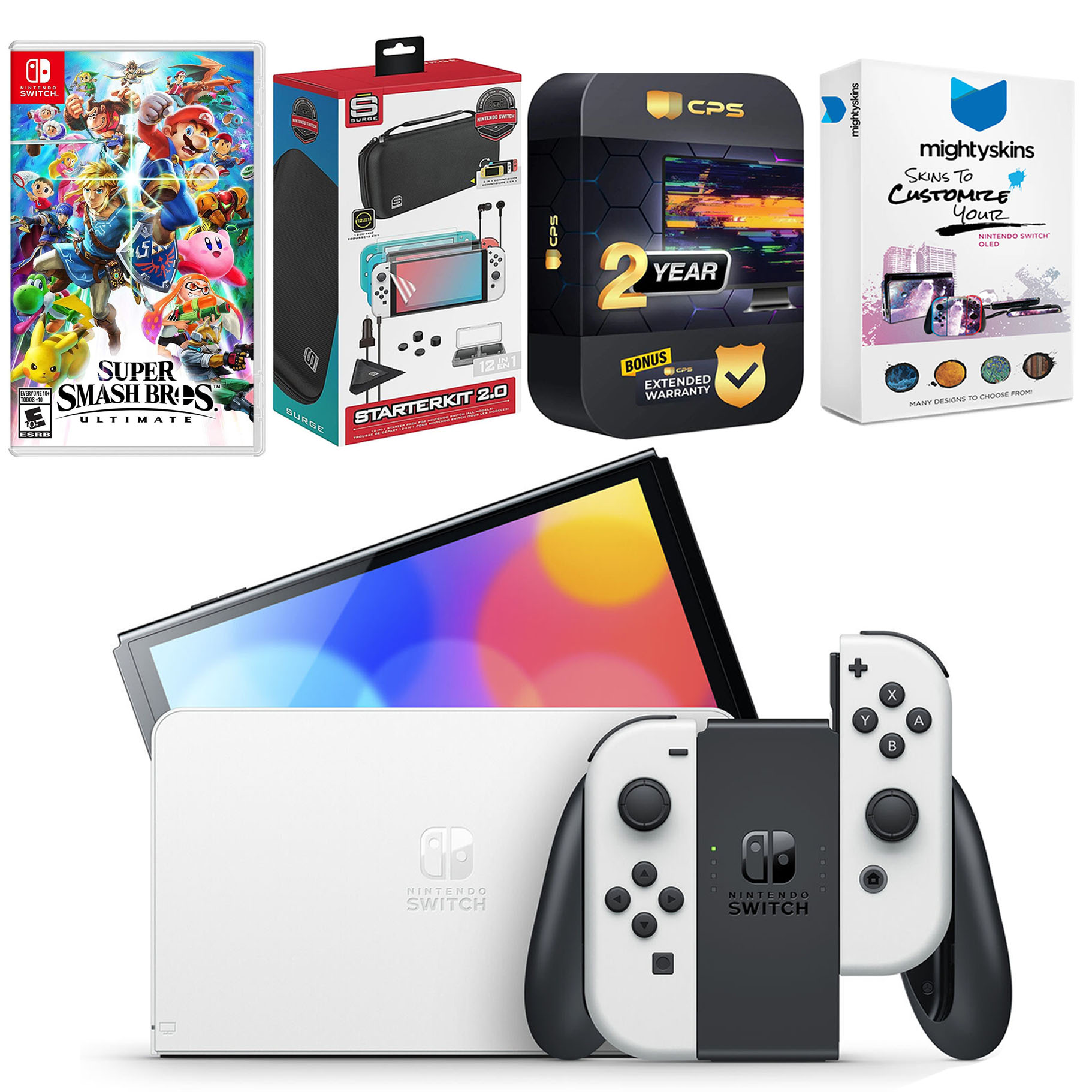 INCLUDED: Nintendo Switch OLED Console, Nintendo Switch OLED Dock, Left & Right Joy-Cons, Joy-Con Wrist Straps, Joy-Con Grip, High speed HDMI Cable, Nintendo Switch AC Adapter, Super Smash Bros: Ultimate game, Surge Accessory Gaming Kit, MightySkins Voucher, and 2 Year CPS Extended Warranty.