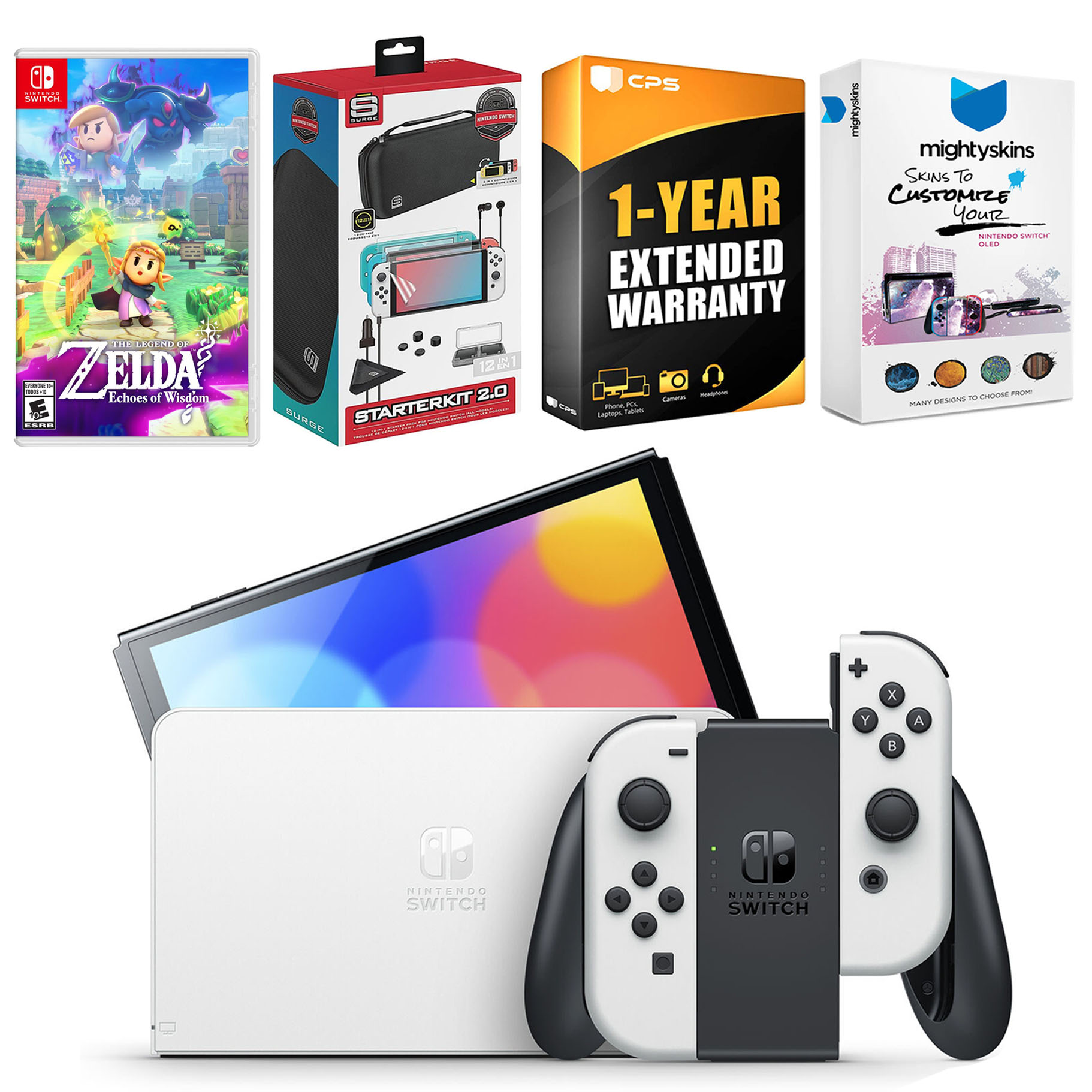INCLUDED: Nintendo Switch OLED Console, Nintendo Switch OLED Dock, Left & Right Joy-Cons, Joy-Con Wrist Straps, Joy-Con Grip, High speed HDMI Cable, Nintendo Switch AC Adapter, The Legend Of Zelda: Echoes Of Wisdom game, Surge Accessory Gaming Kit, MightySkins Voucher, and 1 Year CPS Extended Warranty.