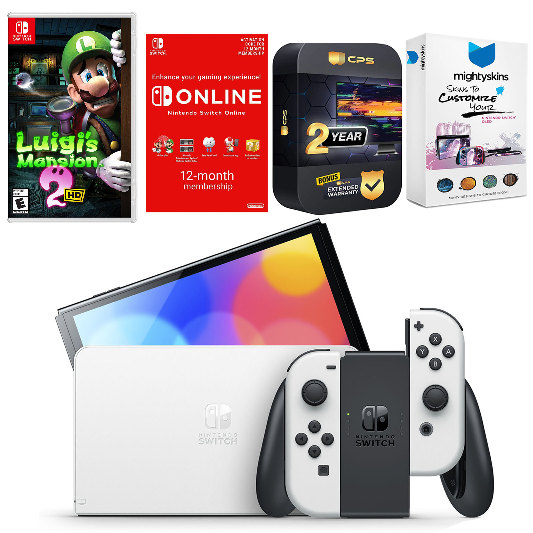 INCLUDED: Nintendo Switch OLED Console, Nintendo Switch OLED Dock, Left & Right Joy-Cons, Joy-Con Wrist Straps, Joy-Con Grip, High speed HDMI Cable, Nintendo Switch AC Adapter, Luigi’s Mansion 2 HD, Nintendo Switch Online 12 Month Family Membership, MightySkins Voucher, and 2 Year CPS Extended Warranty