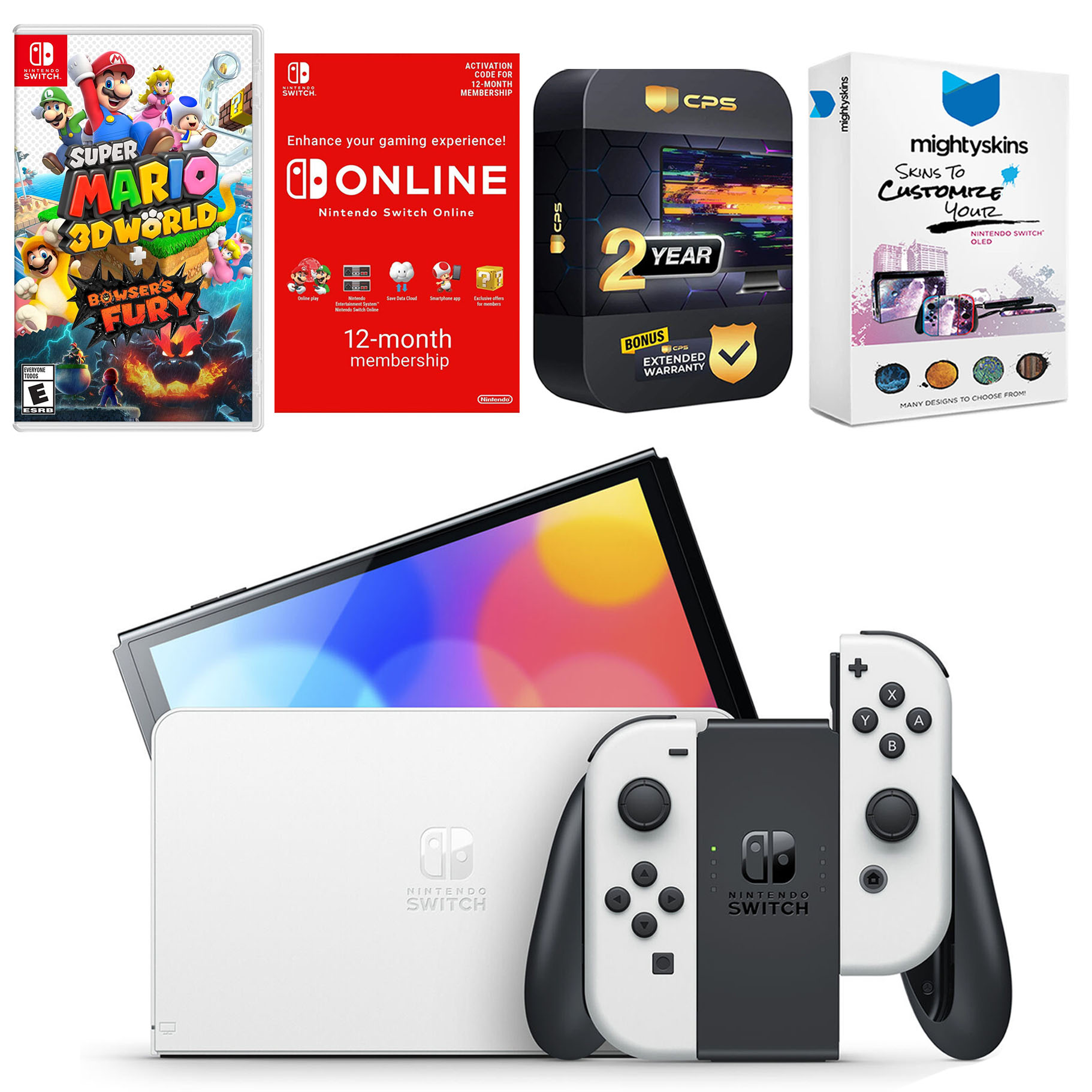 INCLUDED: Nintendo Switch OLED Console, Nintendo Switch OLED Dock, Left & Right Joy-Cons, Joy-Con Wrist Straps, Joy-Con Grip, High speed HDMI Cable, Nintendo Switch AC Adapter, Super Mario 3D World + Bowser’s Fury, Nintendo Switch Online 12 Month Family Membership, MightySkins Voucher, and 2 Year CPS Extended Warranty