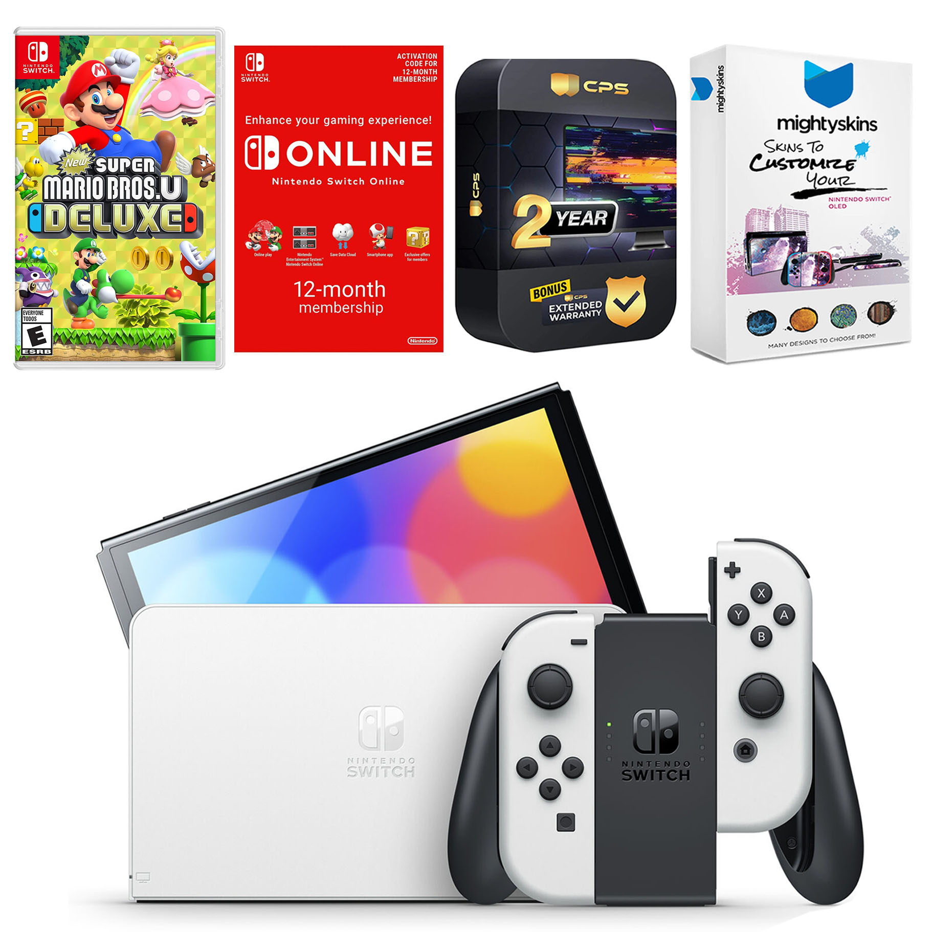 INCLUDED: Nintendo Switch OLED Console, Nintendo Switch OLED Dock, Left & Right Joy-Cons, Joy-Con Wrist Straps, Joy-Con Grip, High speed HDMI Cable, Nintendo Switch AC Adapter, New Super Mario Bros. U Deluxe, Nintendo Switch Online 12 Month Family Membership, MightySkins Voucher, and 2 Year CPS Extended Warranty