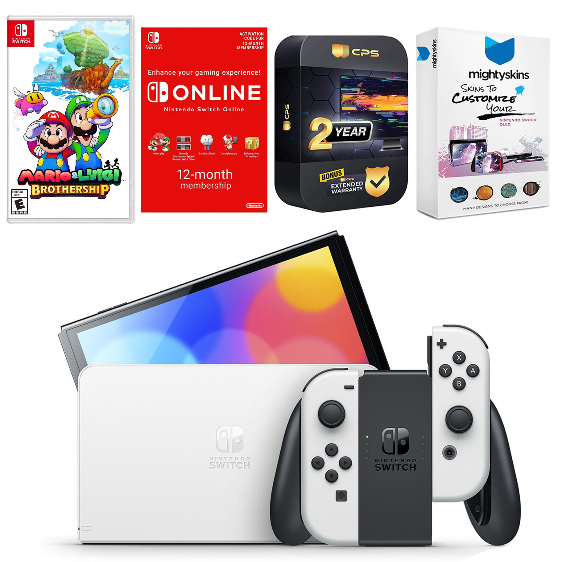 INCLUDED: Nintendo Switch OLED Console, Nintendo Switch OLED Dock, Left & Right Joy-Cons, Joy-Con Wrist Straps, Joy-Con Grip, High speed HDMI Cable, Nintendo Switch AC Adapter, Mario & Luigi: Brothership, Nintendo Switch Online 12 Month Family Membership, MightySkins Voucher, and 2 Year CPS Extended Warranty