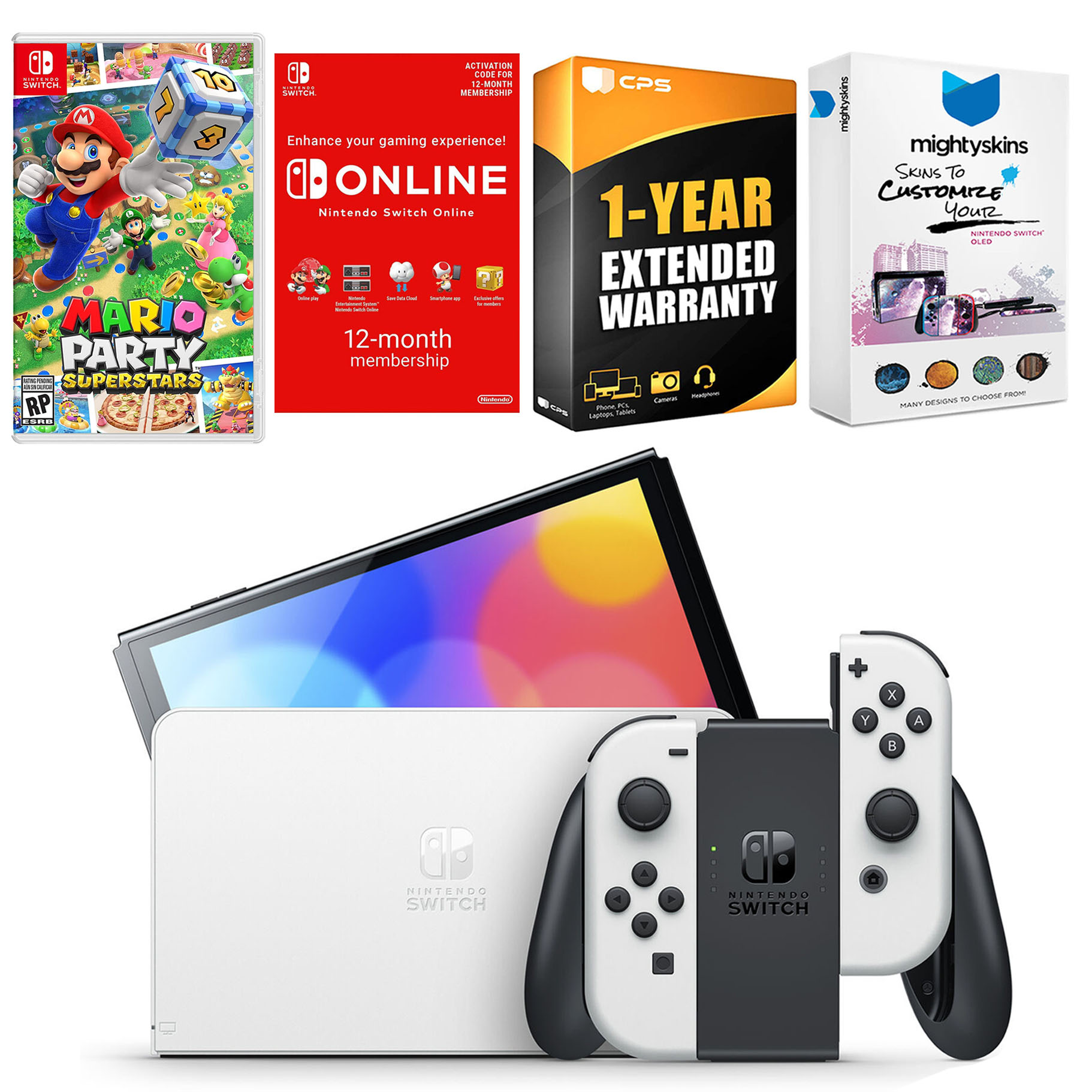 INCLUDED: Nintendo Switch OLED Console, Nintendo Switch OLED Dock, Left & Right Joy-Cons, Joy-Con Wrist Straps, Joy-Con Grip, High speed HDMI Cable, Nintendo Switch AC Adapter, Mario Party Superstars, Nintendo Switch Online 12 Month Family Membership, MightySkins Voucher, and 1 Year CPS Extended Warranty