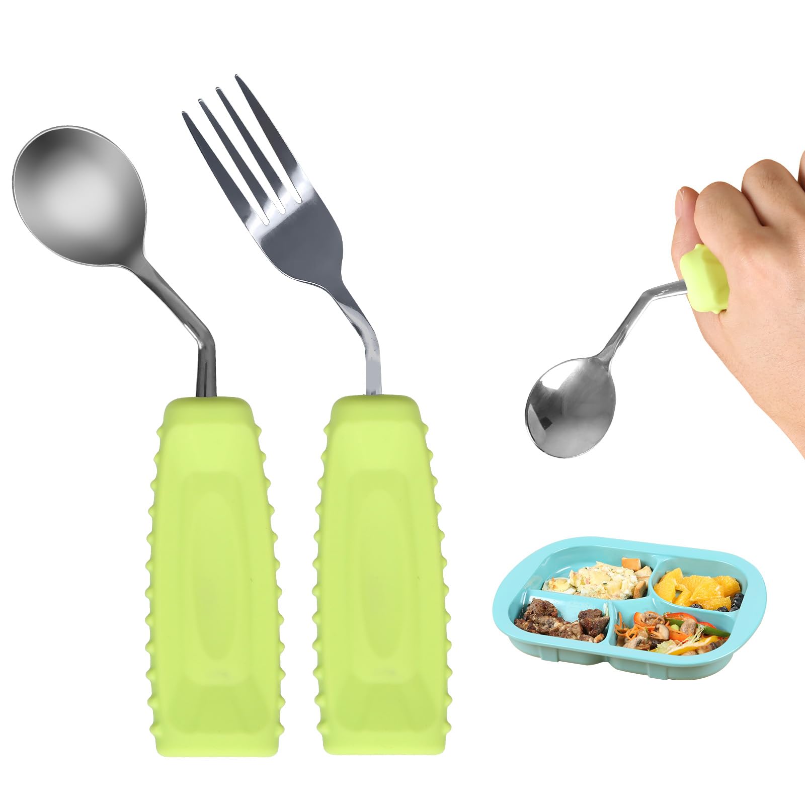EZ's innovative adaptive fork spoon is designed to help people with hand tremors, arthritis, hand and other conditions that affect grip strength eat more easily. The Arthritis Hand Fork is made of durable and safe stainless steel to ensure long-term use. The thoughtful silicone handle provides a comfortable grip, bright and colorful colors promote appetite, and the curved design reduces wrist fatigue and promotes independent eating. Adaptive forks and spoons are an essential aid to improve quality of life. Choose from our sales portfolio options, designed with additional features for left- or right-handed use, find a set of cutlery for the elderly, arthritis sufferers, or people with weak hand grip.Non-slip textured design ensures a secure grip, and these Parkinson's patient cutlery are a must-have for anyone who wants to remain independent during their meals. Elevate your dining experience with our Parkinson's living aids and enjoy the freedom of a well-designed, adaptive device