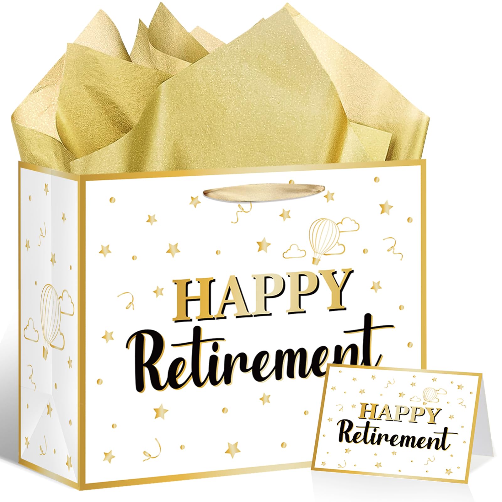 Specification: Material: Thick cardboard Size: Retirement Gift Bag: 11.8 x 9.4 x 5.3 inches Retirement Greeting Card: 7.1 x 4.7 inches Tissue paper: 27.6 x 19.7 inches Package content: 1 × Retirement Gift Bag 1 × Greeting card 3 × Tissue papers Notice: 1.Product size data is measured manually, and there may be 1-3cm error, thank you for your understanding 2.Due to the light and the display, picture may be slightly different from the real product color, thank you for your understanding