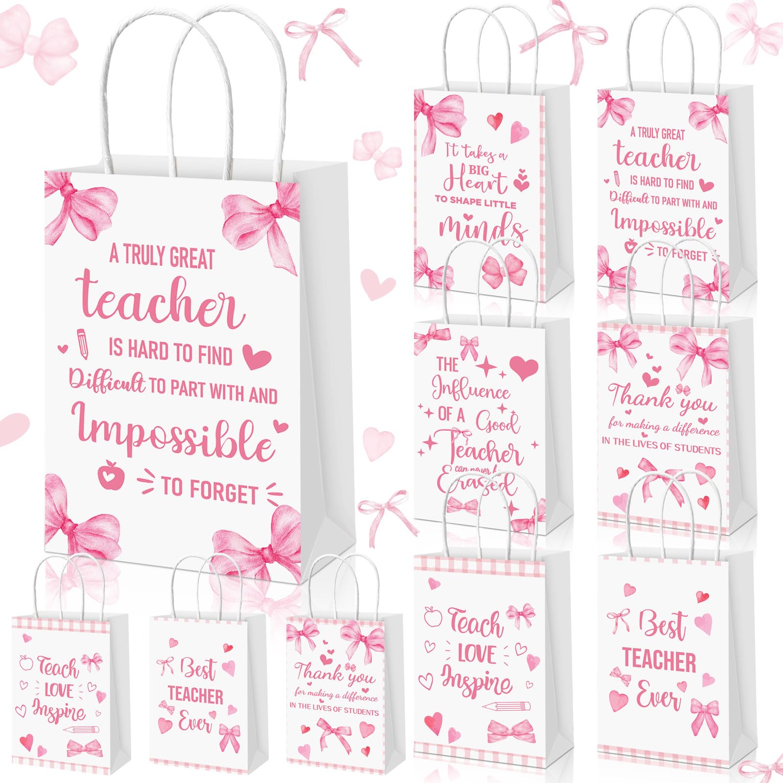 Features: Wide applications: The Teacher's Day gift bag has a wide range of uses and can be used to hold small toys, candies, stationery, and more. It is good for pink themed celebrations and can also be used as a delicate decoration for Teacher's Day, birthdays, or back to school parties. Unique prizes for girls: The bow gift bag is a unique pink ceremonial bow birthday decoration customized for little girls as a Teacher's Day gift. These pink bow bags are designed with stylish and unique pink bow patterns, exquisite and beautiful, making your party stand out. Specifications: Color: pink and white Size: about 5.9 x 3.1 x 8.3 inches/ 15 x 8 x 21 cm Package includes: 24x Pink bow Kraft Paper Bags Notes: Manual measurement, please allow slight errors on size. The color may exist a slight difference due to different screen displays.