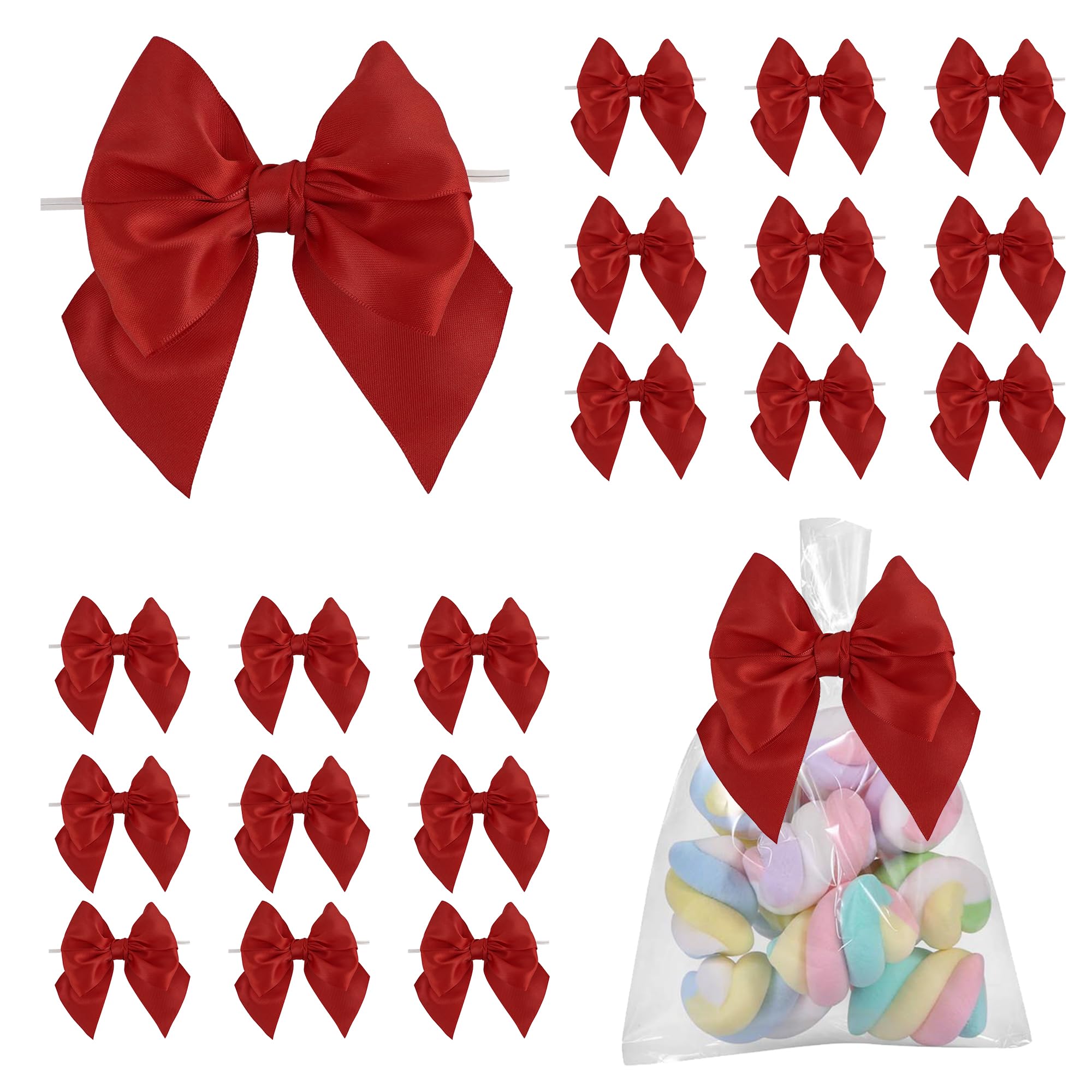 What is this? These premade satin bows can be used for and hold party favor bags, treat bags and gift bags that contain candy, bakes goods, cookies, cake pop, candy apple and brownies. Because of the satin ribbon with a signature ribbed texture, they are all handmade in good shape and look delicate and cute. What will I get? A beautiful paper packaging box. The bow you purchased is securely sealed in a transparent plastic bag inside the paper box. Material: Satin Ribbon Size: 4 inch * 4 inch Quantity: 24 PCs Same Color Ribbon Bows Are there any advantages of the product? 1. Satin ribbon material: beautiful luster, fine texture, washable and firm, non fading, wrinkle resistant, comfortable hand feel. 2. Premade design feature simplifies the application process, eliminating the need for additional adhesives. 3. Our bow is bright in color, fashionable and new in design, and can be used on many occasions. It is suitable for baby shower gift, Christmas gifts, baking decorations, gift box packaging, hotel decorations, wedding decorations, flower packaging, birthday arrangements, etc. How to use it? 1. Choose a bow color that matches your project or gift wrap. 2. Adjust the length of the twist tie to fit the item you are decorating. The twist tie is removable and can be easily pulled out if not needed. Place the satin ribbon bow on the desired surface, such as a gift box, card or craft piece. Twist the twist tie together to secure it. 3. Adjust the position of the bow if necessary to achieve the desired look. Twist tie can be reused and are transparent, without affecting decoration. What should I notice? Manual measurement, please allow slight errors in size. Please note that the color may exist a slight difference due to different screen displays, and the color is subject to the actual product received.