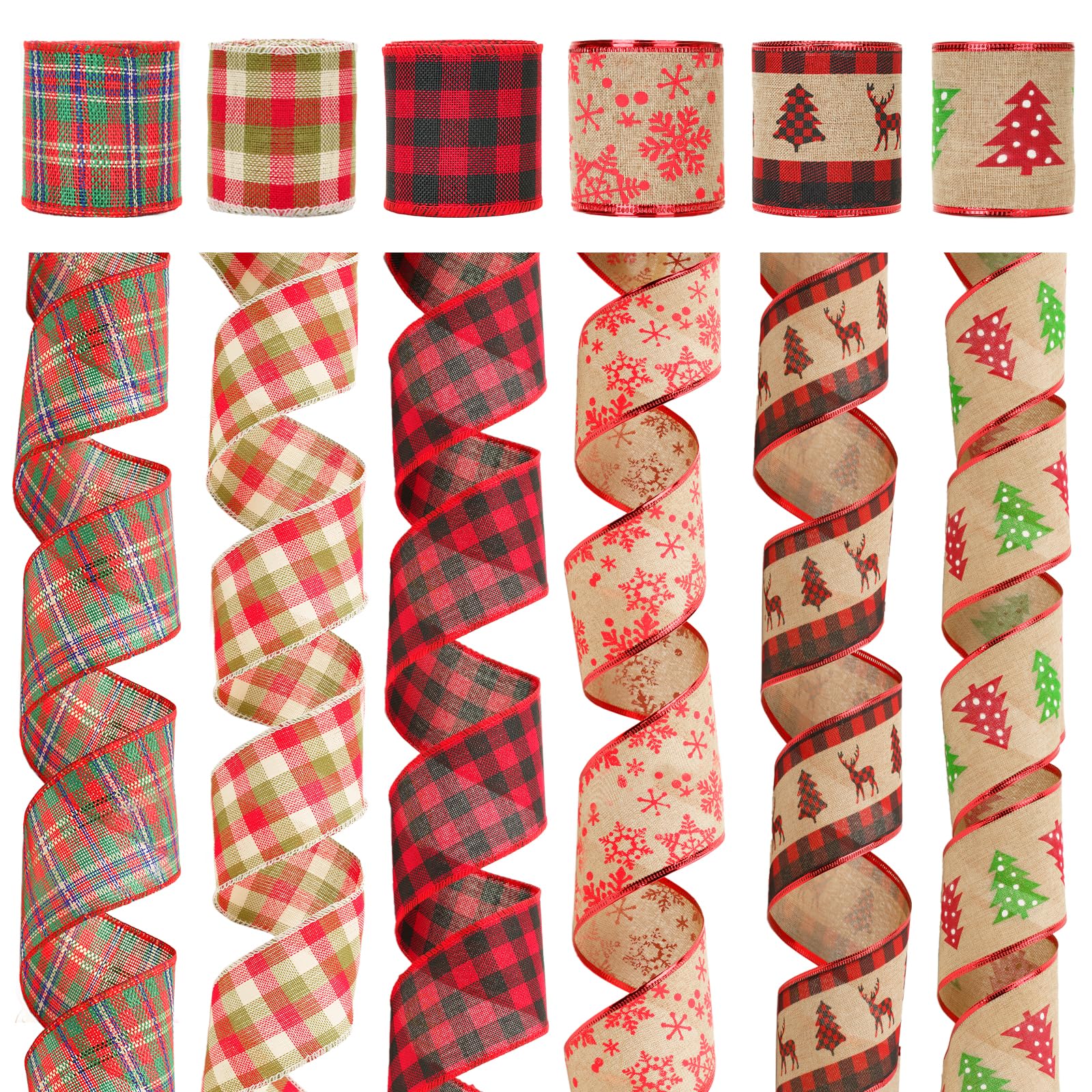 Our christmas ribbon wired are made from high-quality polyester and metallic wire, with both sides of each plaid christmas ribbon finely stitched with sparkling webbing. This 6 rolls set of Christmas decorative ribbons features 6 different designs, each roll measuring 2.5 inches wide and adorned with golden metallic wire edges. These buffalo plaid checkered ribbon are easy to bend and hold their shape, making them perfect for creating bows that are both elegant and rustic. All the gingham ribbon are protected with plastic to ensure cleanliness, making them easy to use for bow-making and various holiday decorations. These plaid ribbon for christmas tree are ideal for anything from decorating gift wraps to wreaths, wedding decorations, and DIY home craft projects. This set of wired christmas ribbon for gift wrappingnot only enhances the decorative effect of Christmas trees and yards, but it also makes an excellent gift for crafters and DIY enthusiasts, helping them seamlessly kick-start their holiday creativity.