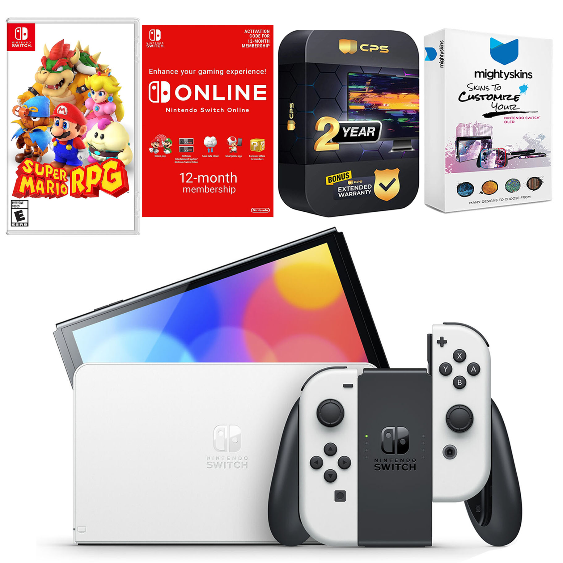 INCLUDED: Nintendo Switch OLED Console, Nintendo Switch OLED Dock, Left & Right Joy-Cons, Joy-Con Wrist Straps, Joy-Con Grip, High speed HDMI Cable, Nintendo Switch AC Adapter, Super Mario RPG, Nintendo Switch Online 12 Month Family Membership, MightySkins Voucher, and 2 Year CPS Extended Warranty