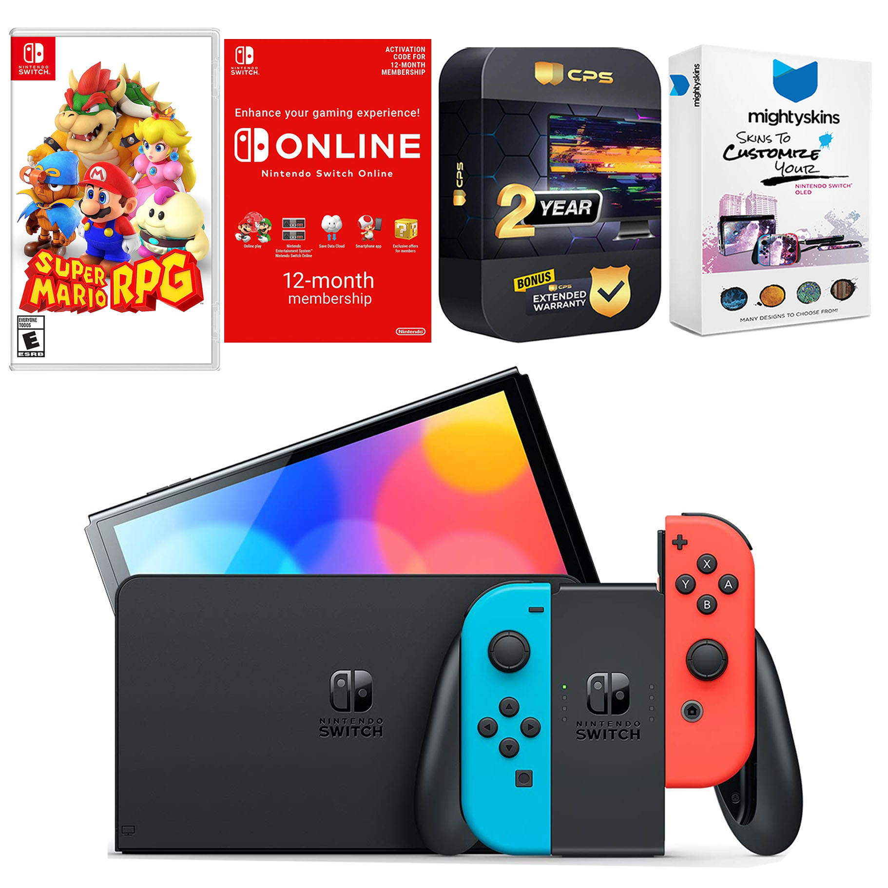 INCLUDED: Nintendo Switch OLED Console, Nintendo Switch OLED Dock, Left & Right Joy-Cons, Joy-Con Wrist Straps, Joy-Con Grip, High speed HDMI Cable, Nintendo Switch AC Adapter, Super Mario RPG, Nintendo Switch Online 12 Month Family Membership, MightySkins Voucher, and 2 Year CPS Extended Warranty