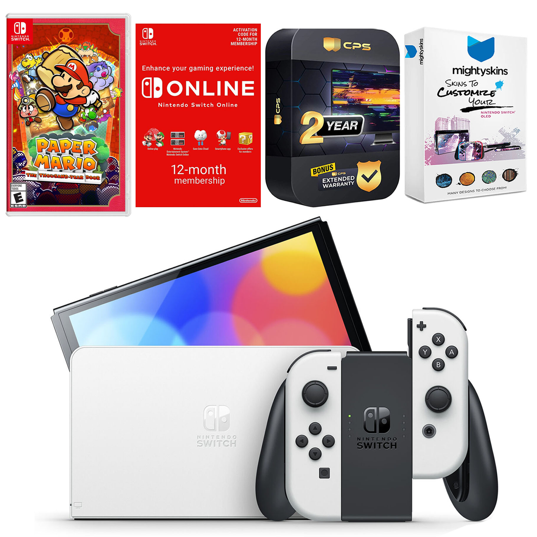 INCLUDED: Nintendo Switch OLED Console, Nintendo Switch OLED Dock, Left & Right Joy-Cons, Joy-Con Wrist Straps, Joy-Con Grip, High speed HDMI Cable, Nintendo Switch AC Adapter, Paper Mario: The Thousand Year Door, Nintendo Switch Online 12 Month Family Membership, MightySkins Voucher, and 2 Year CPS Extended Warranty