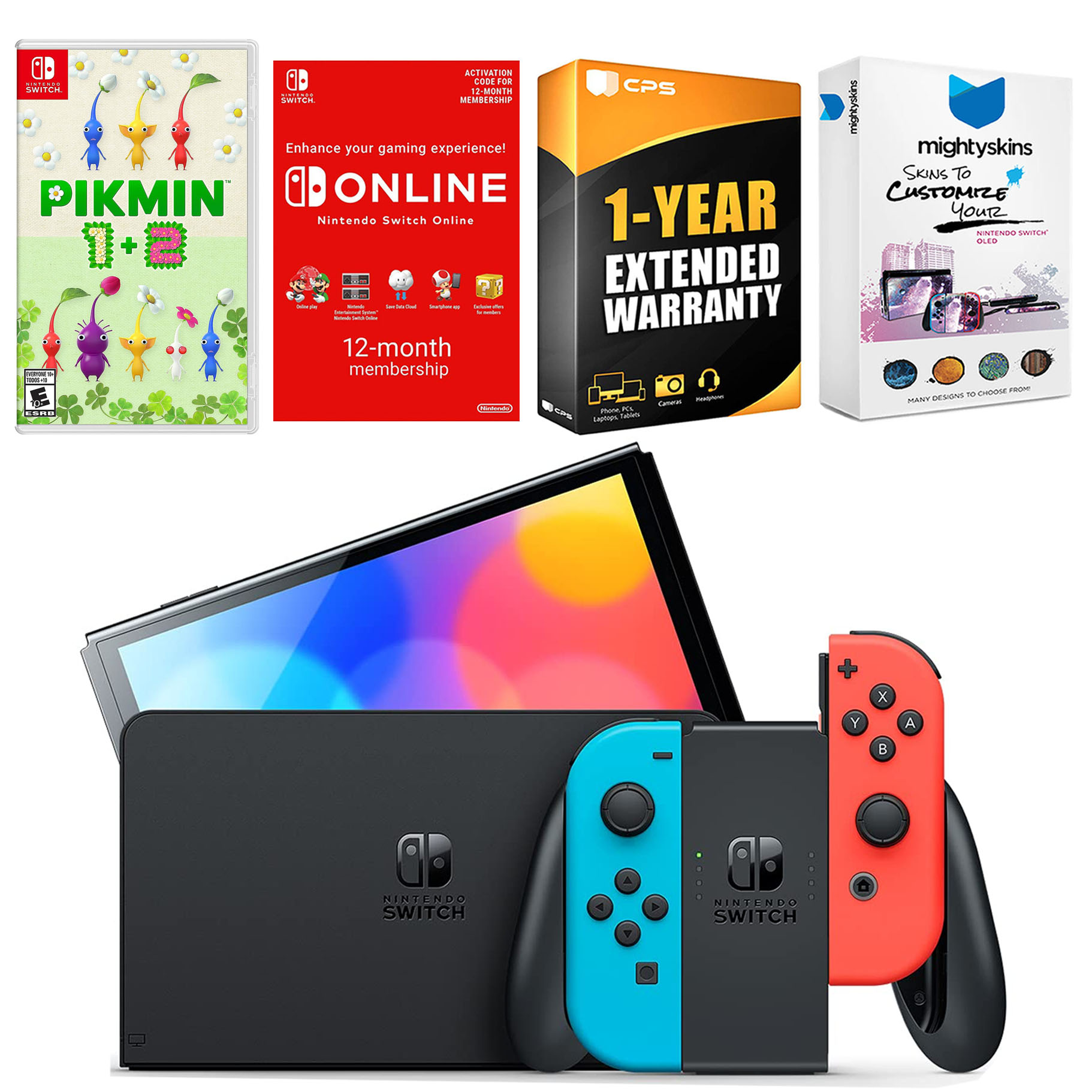 INCLUDED: Nintendo Switch OLED Console, Nintendo Switch OLED Dock, Left & Right Joy-Cons, Joy-Con Wrist Straps, Joy-Con Grip, High speed HDMI Cable, Nintendo Switch AC Adapter, Pikmin 1 + 2, Nintendo Switch Online 12 Month Family Membership, MightySkins Voucher, and 1 Year CPS Extended Warranty