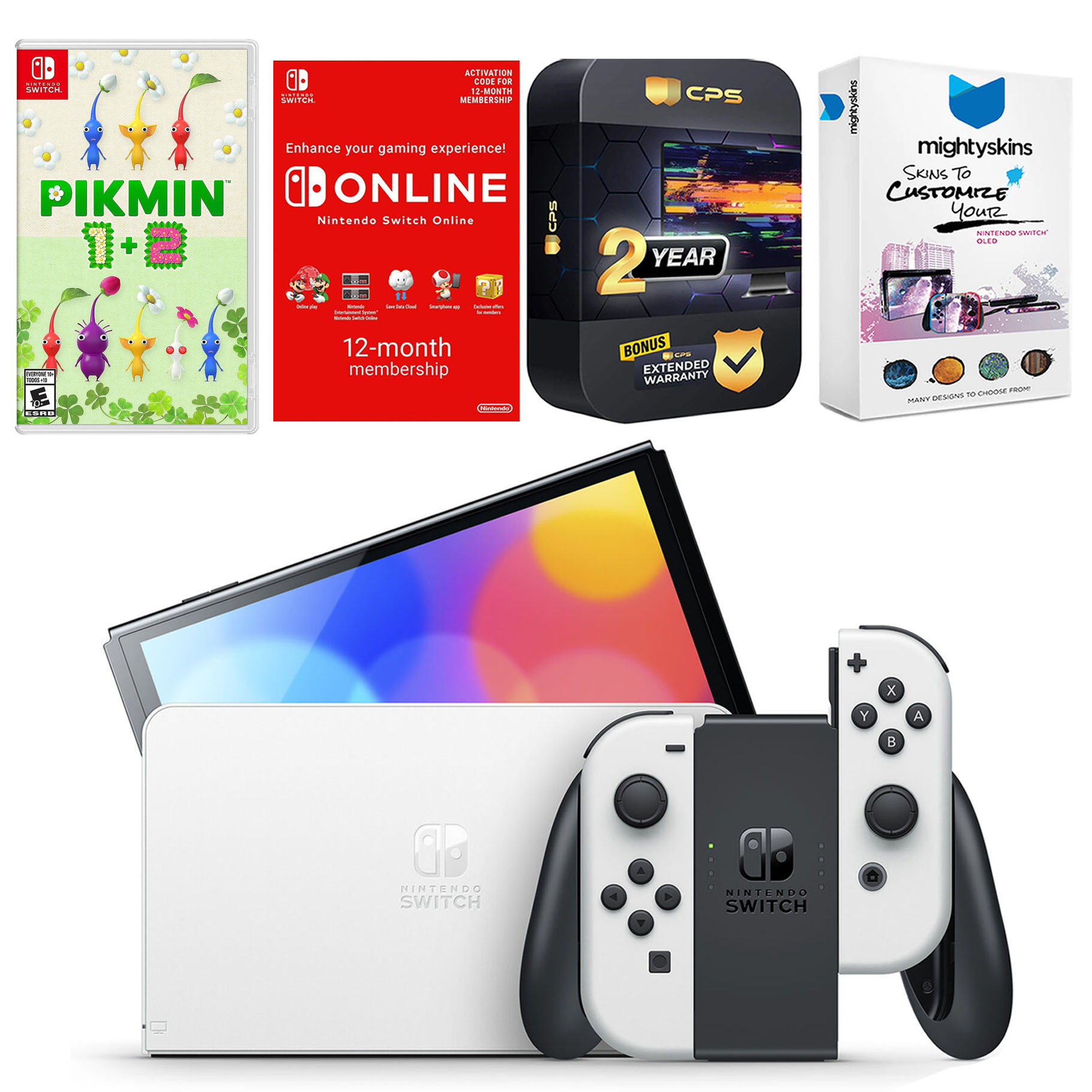 INCLUDED: Nintendo Switch OLED Console, Nintendo Switch OLED Dock, Left & Right Joy-Cons, Joy-Con Wrist Straps, Joy-Con Grip, High speed HDMI Cable, Nintendo Switch AC Adapter, Pikmin 1 + 2, Nintendo Switch Online 12 Month Family Membership, MightySkins Voucher, and 2 Year CPS Extended Warranty