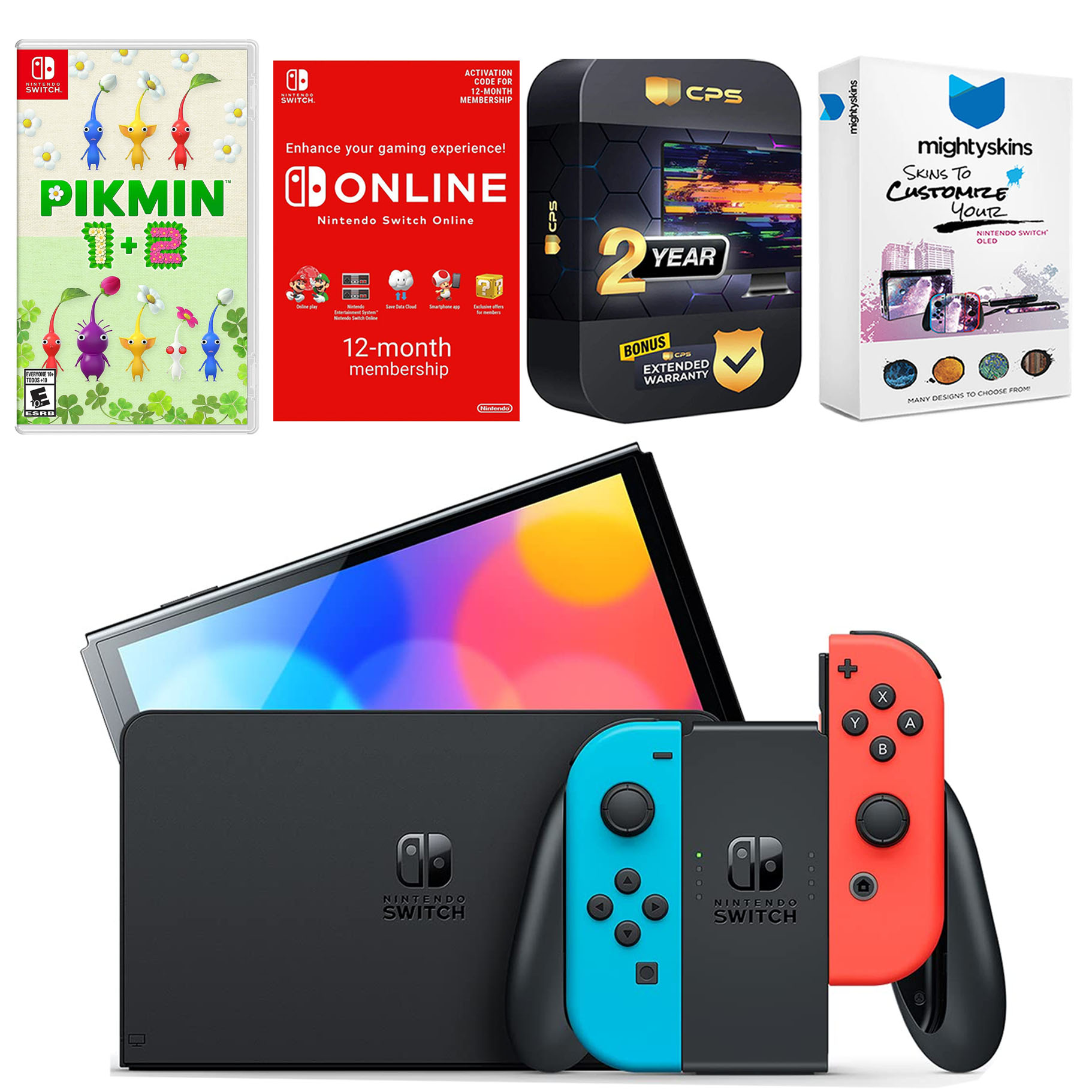 INCLUDED: Nintendo Switch OLED Console, Nintendo Switch OLED Dock, Left & Right Joy-Cons, Joy-Con Wrist Straps, Joy-Con Grip, High speed HDMI Cable, Nintendo Switch AC Adapter, Pikmin 1 + 2, Nintendo Switch Online 12 Month Family Membership, MightySkins Voucher, and 2 Year CPS Extended Warranty