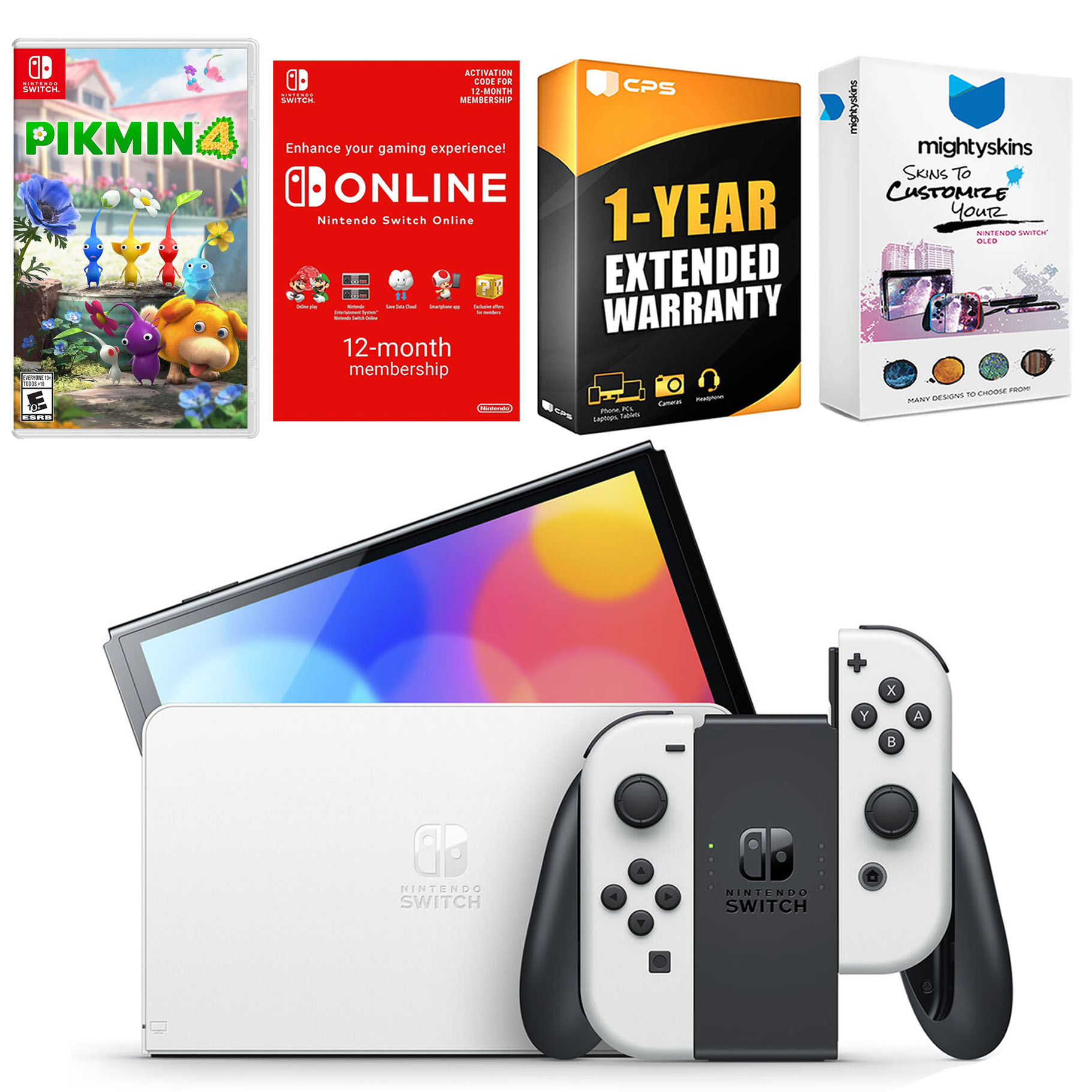 INCLUDED: Nintendo Switch OLED Console, Nintendo Switch OLED Dock, Left & Right Joy-Cons, Joy-Con Wrist Straps, Joy-Con Grip, High speed HDMI Cable, Nintendo Switch AC Adapter, Pikmin 4, Nintendo Switch Online 12 Month Family Membership, MightySkins Voucher, and 1 Year CPS Extended Warranty