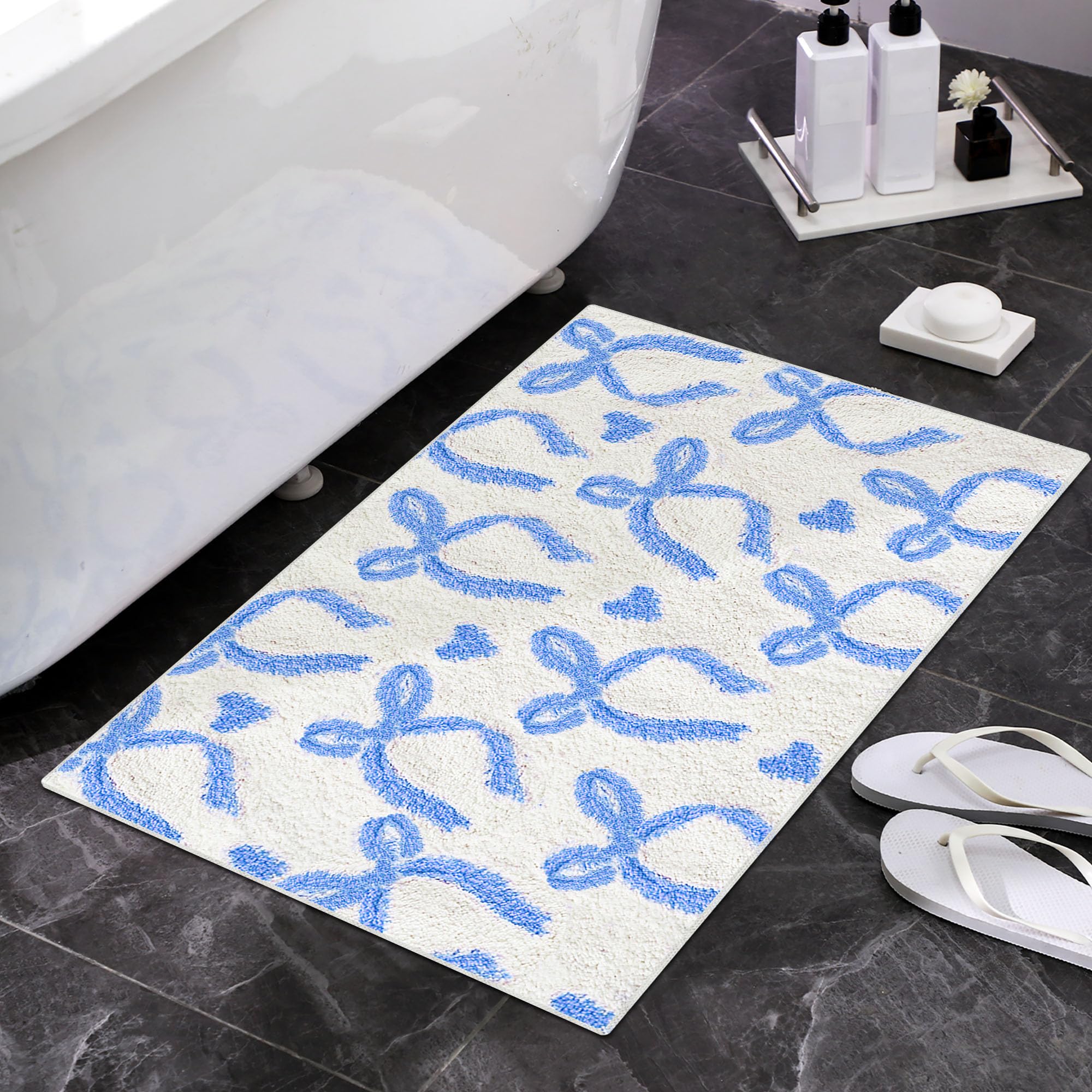 Features: This charming bow bath rug is the ideal blend of style, functionality, and sustainability. Its versatility allows it to enhance any space, from bathrooms to living rooms, while its non-slip backing ensures safety and stability. The preppy coquette blue rug decor serves as a thoughtful gift option, making it an excellent choice for celebrating special occasions with friends and family and adding a touch of warmth to any home. Upgrade your home decor and embrace both comfort and conscientious living with this delightful accessory. Specifications: Material: flocking Color: blue Size: 50 x 80 cm/20 x 32 inches Package includes: 1 X Bow bathroom rug Notes: Manual measurement, please allow slight errors on size. The color may exist a slight difference due to different screen displays.