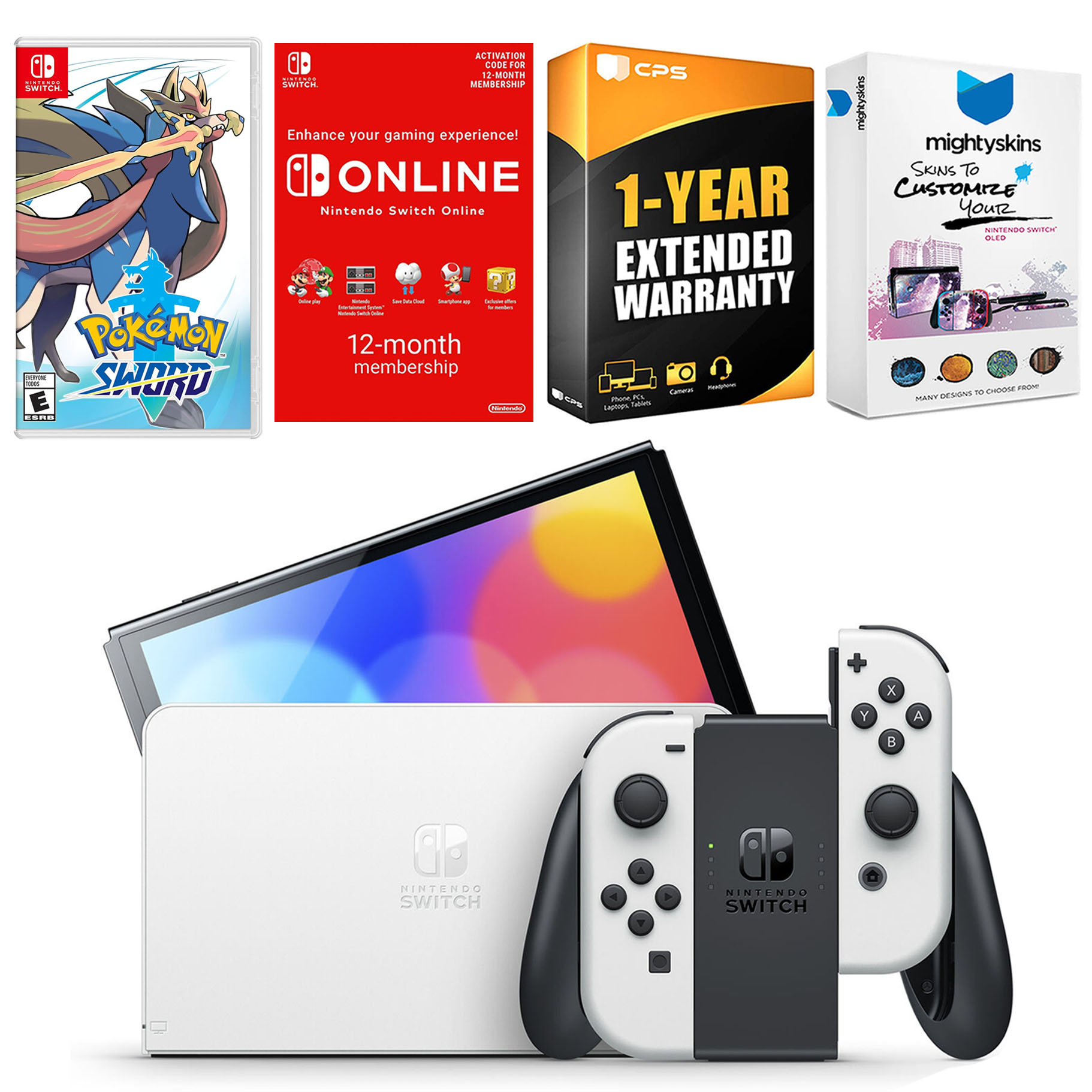 INCLUDED: Nintendo Switch OLED Console, Nintendo Switch OLED Dock, Left & Right Joy-Cons, Joy-Con Wrist Straps, Joy-Con Grip, High speed HDMI Cable, Nintendo Switch AC Adapter, Pokemon Sword, Nintendo Switch Online 12 Month Family Membership, MightySkins Voucher, and 1 Year CPS Extended Warranty