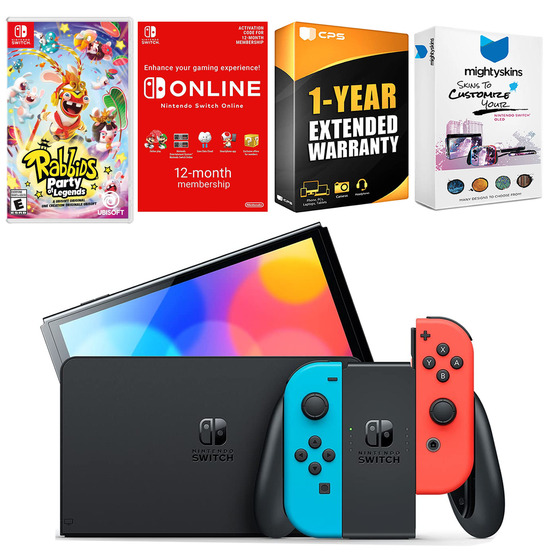 INCLUDED: Nintendo Switch OLED Console, Nintendo Switch OLED Dock, Left & Right Joy-Cons, Joy-Con Wrist Straps, Joy-Con Grip, High speed HDMI Cable, Nintendo Switch AC Adapter, Rabbids: Party of Legends, Nintendo Switch Online 12 Month Family Membership, MightySkins Voucher, and 1 Year CPS Extended Warranty