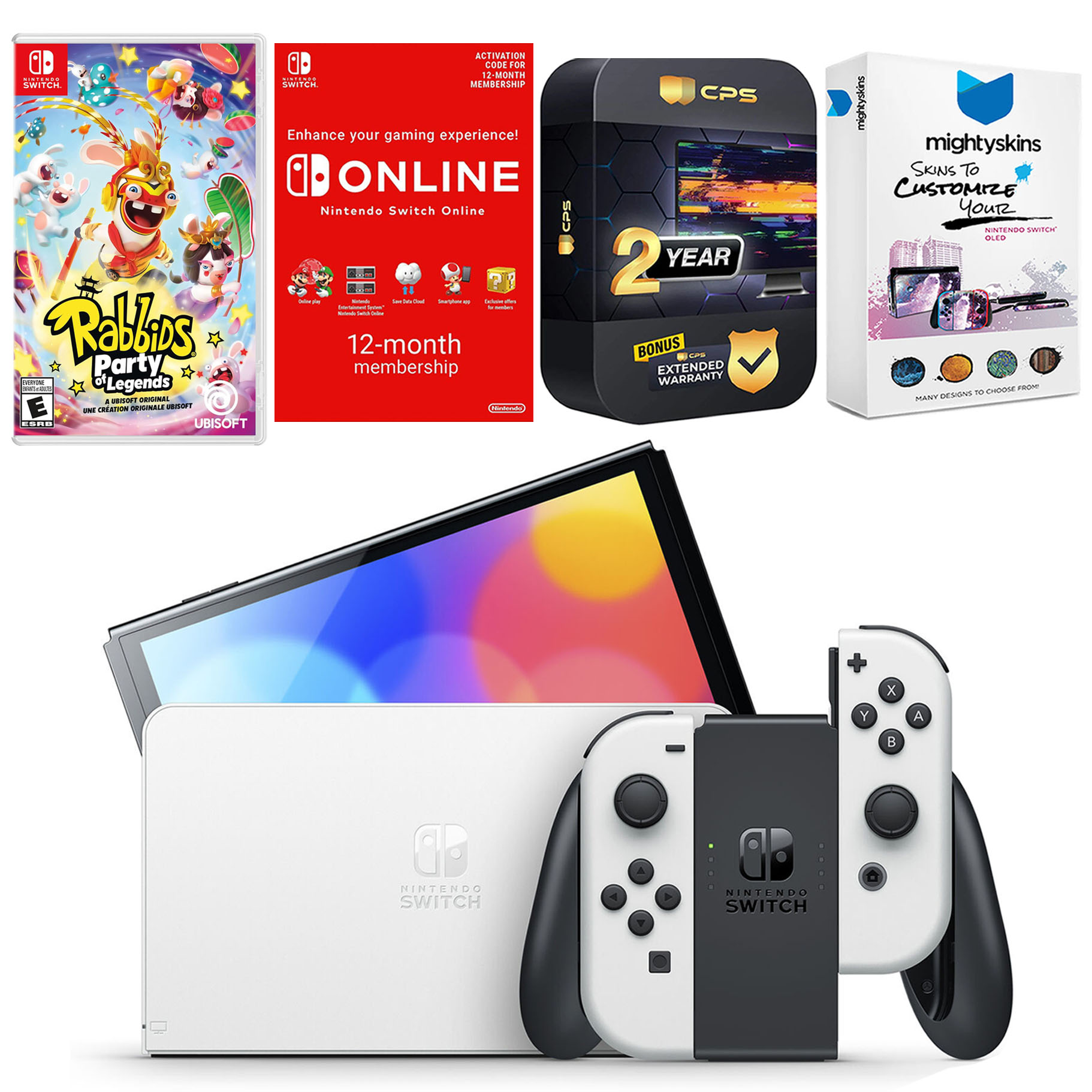 INCLUDED: Nintendo Switch OLED Console, Nintendo Switch OLED Dock, Left & Right Joy-Cons, Joy-Con Wrist Straps, Joy-Con Grip, High speed HDMI Cable, Nintendo Switch AC Adapter, Rabbids: Party of Legends, Nintendo Switch Online 12 Month Family Membership, MightySkins Voucher, and 2 Year CPS Extended Warranty