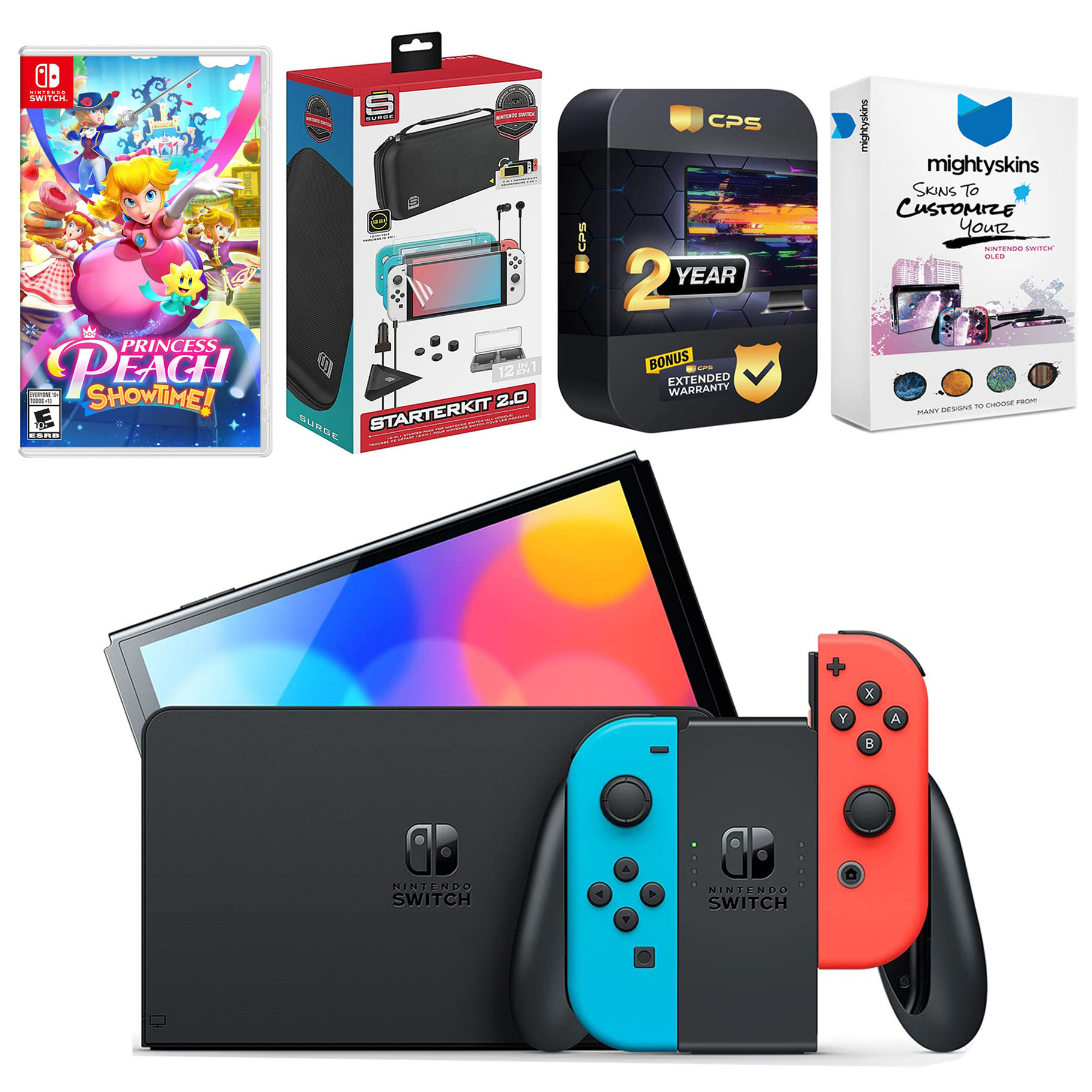 INCLUDED: Nintendo Switch OLED Console, Nintendo Switch OLED Dock, Left & Right Joy-Cons, Joy-Con Wrist Straps, Joy-Con Grip, High speed HDMI Cable, Nintendo Switch AC Adapter, Princess Peach: Showtime! game, Surge Accessory Gaming Kit, MightySkins Voucher, and 2 Year CPS Extended Warranty.