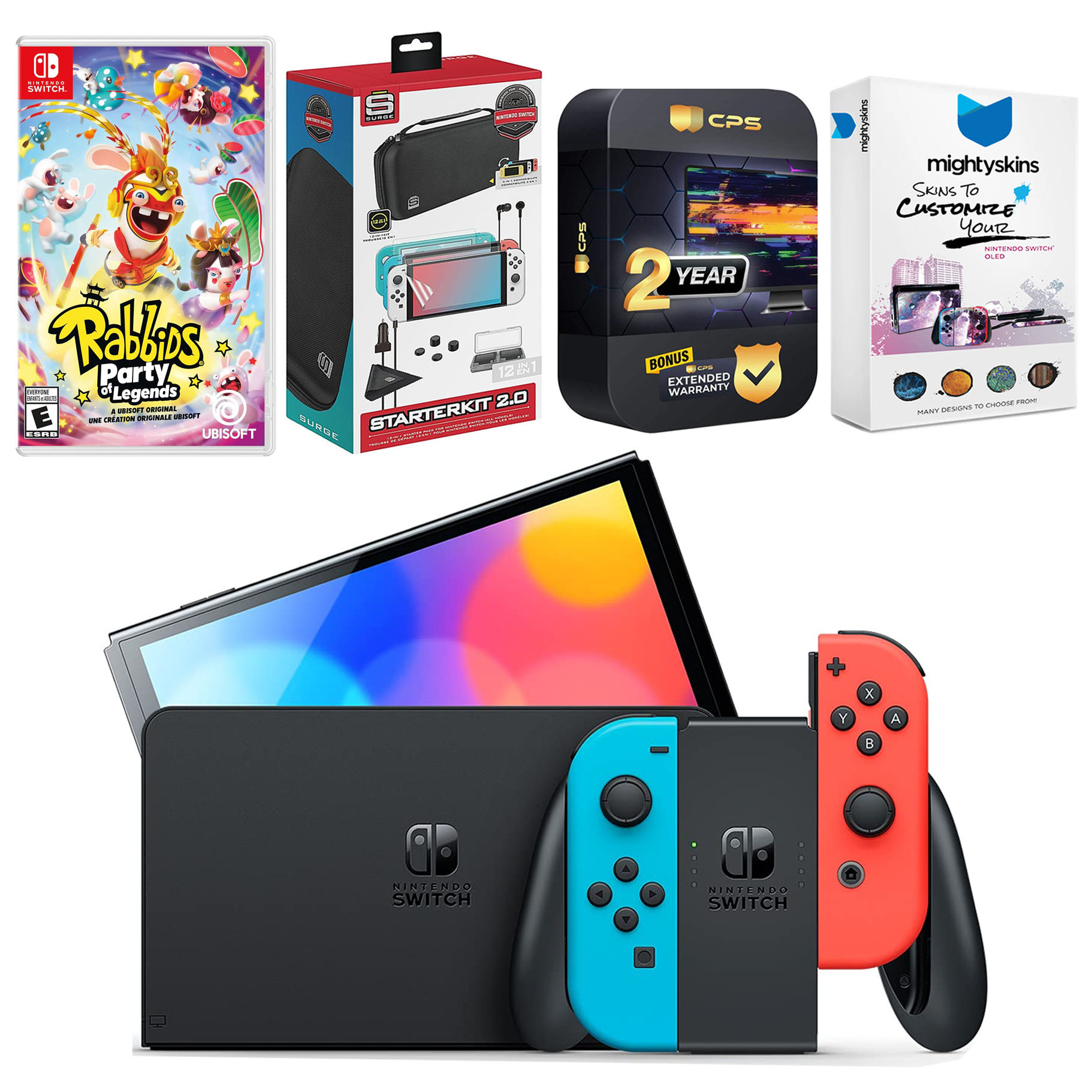 INCLUDED: Nintendo Switch OLED Console, Nintendo Switch OLED Dock, Left & Right Joy-Cons, Joy-Con Wrist Straps, Joy-Con Grip, High speed HDMI Cable, Nintendo Switch AC Adapter, Rabbids: Party of Legends game, Surge Accessory Gaming Kit, MightySkins Voucher, and 2 Year CPS Extended Warranty.