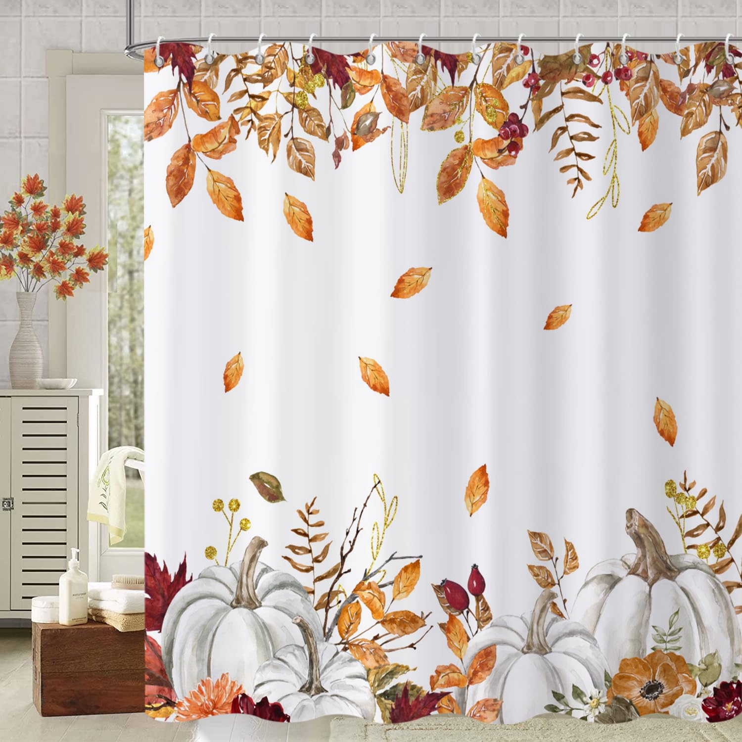 Machine washable. Do not bleach or dry clean. The fall shower curtain is long-lasting and durable for many washes.