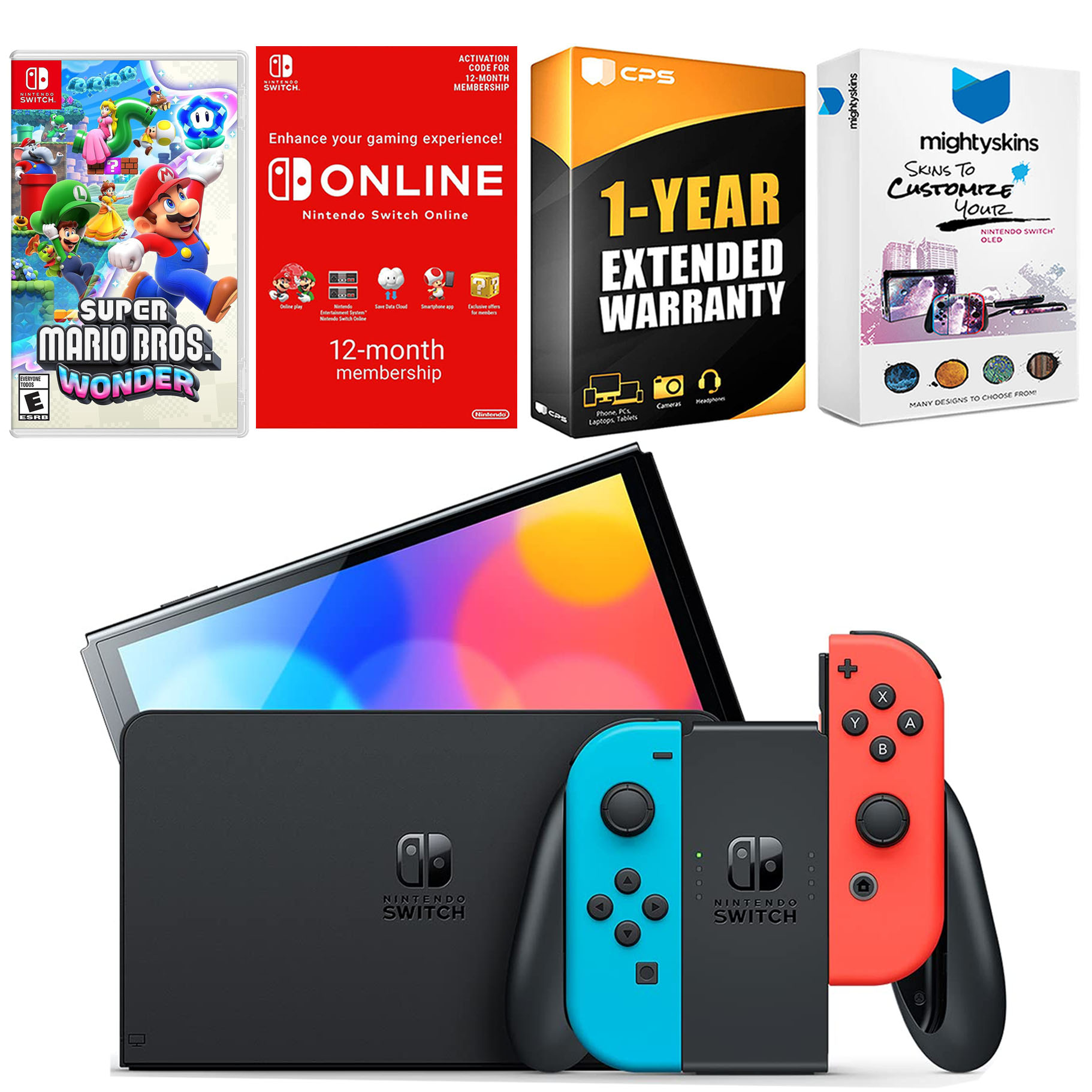 INCLUDED: Nintendo Switch OLED Console, Nintendo Switch OLED Dock, Left & Right Joy-Cons, Joy-Con Wrist Straps, Joy-Con Grip, High speed HDMI Cable, Nintendo Switch AC Adapter, Super Mario Bros. Wonder, Nintendo Switch Online 12 Month Family Membership, MightySkins Voucher, and 1 Year CPS Extended Warranty