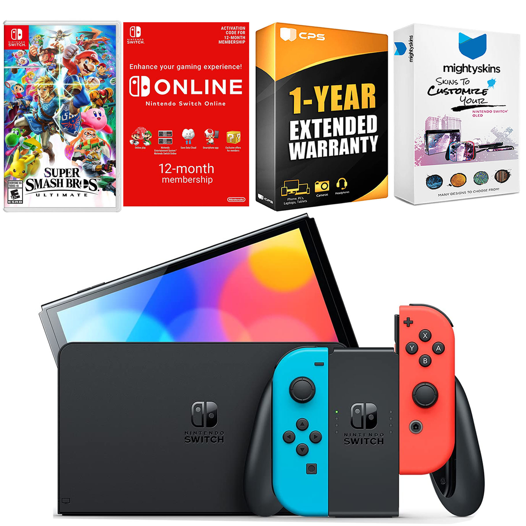 INCLUDED: Nintendo Switch OLED Console, Nintendo Switch OLED Dock, Left & Right Joy-Cons, Joy-Con Wrist Straps, Joy-Con Grip, High speed HDMI Cable, Nintendo Switch AC Adapter, Super Smash Bros: Ultimate, Nintendo Switch Online 12 Month Family Membership, MightySkins Voucher, and 1 Year CPS Extended Warranty