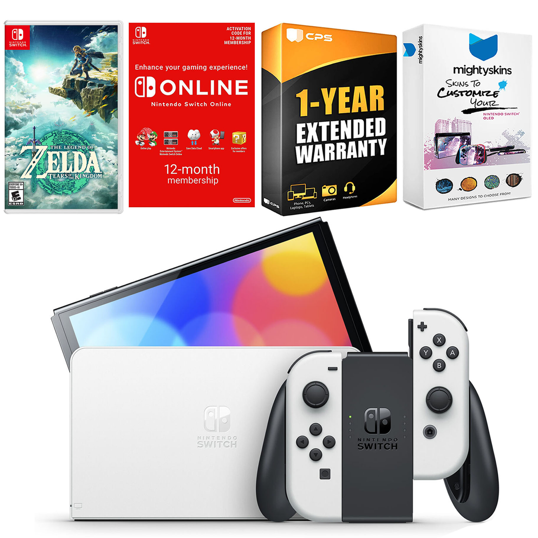 INCLUDED: Nintendo Switch OLED Console, Nintendo Switch OLED Dock, Left & Right Joy-Cons, Joy-Con Wrist Straps, Joy-Con Grip, High speed HDMI Cable, Nintendo Switch AC Adapter, The Legend of Zelda: Tears of the Kingdom, Nintendo Switch Online 12 Month Family Membership, MightySkins Voucher, and 1 Year CPS Extended Warranty