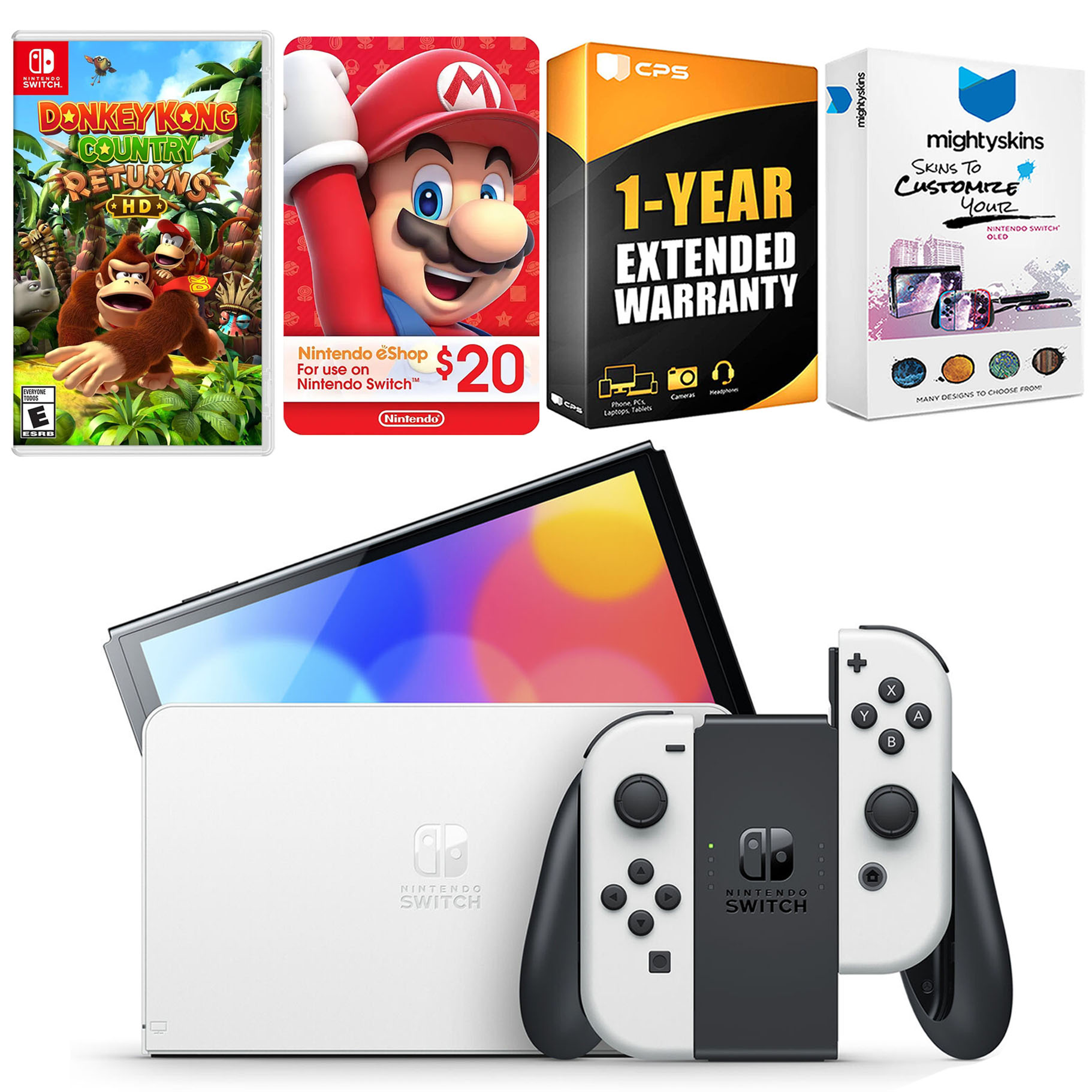 INCLUDED: Nintendo Switch OLED Console, Nintendo Switch OLED Dock, Left & Right Joy-Cons, Joy-Con Wrist Straps, Joy-Con Grip, High speed HDMI Cable, Nintendo Switch AC Adapter, Donkey Kong Country Returns HD, Nintendo $20 eShop Gift Physical Card, MightySkins Voucher, and 1 Year CPS Extended Warranty
