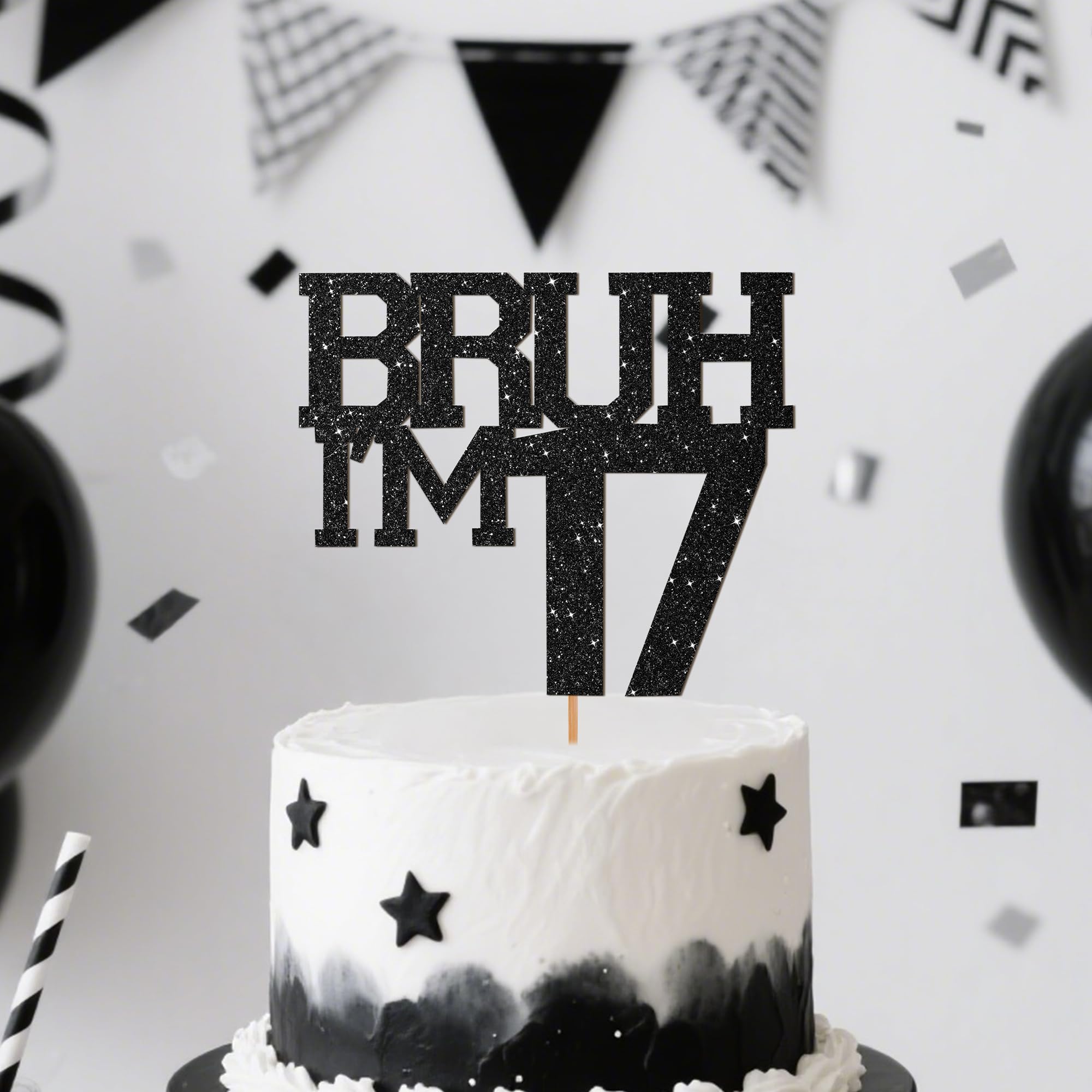 How can you celebrate your 17th birthday without this black glitter sweet ''Bruh I'm 17'' cake decorations?