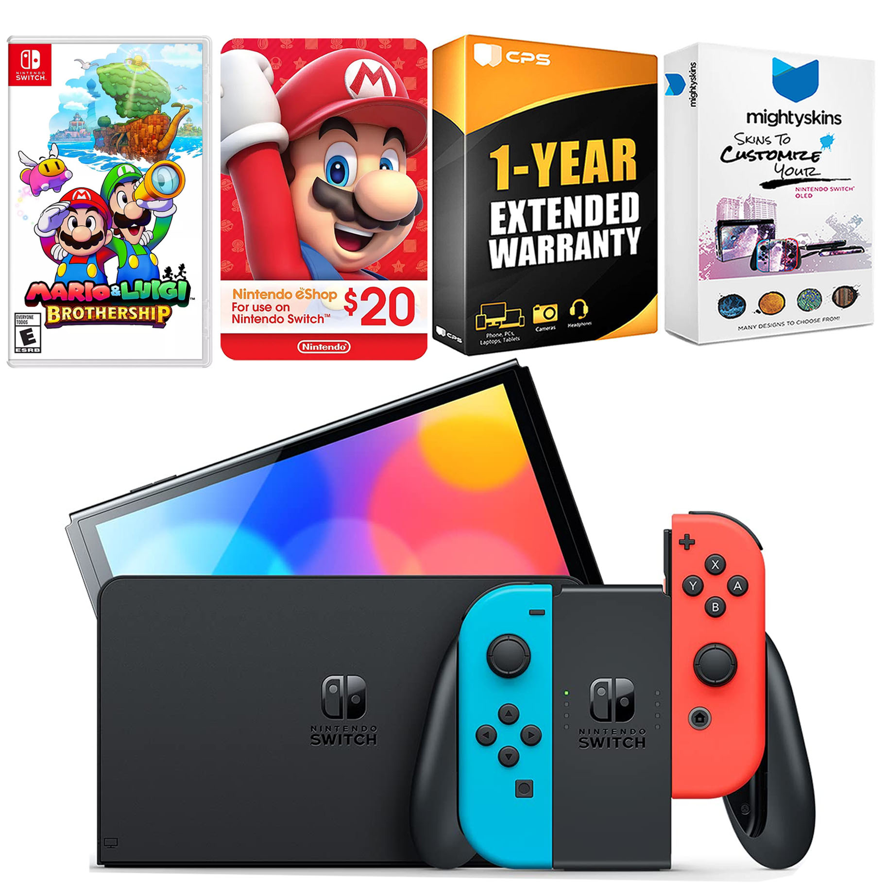 INCLUDED: Nintendo Switch OLED Console, Nintendo Switch OLED Dock, Left & Right Joy-Cons, Joy-Con Wrist Straps, Joy-Con Grip, High speed HDMI Cable, Nintendo Switch AC Adapter, Mario & Luigi: Brothership, Nintendo $20 eShop Gift Physical Card, MightySkins Voucher, and 1 Year CPS Extended Warranty