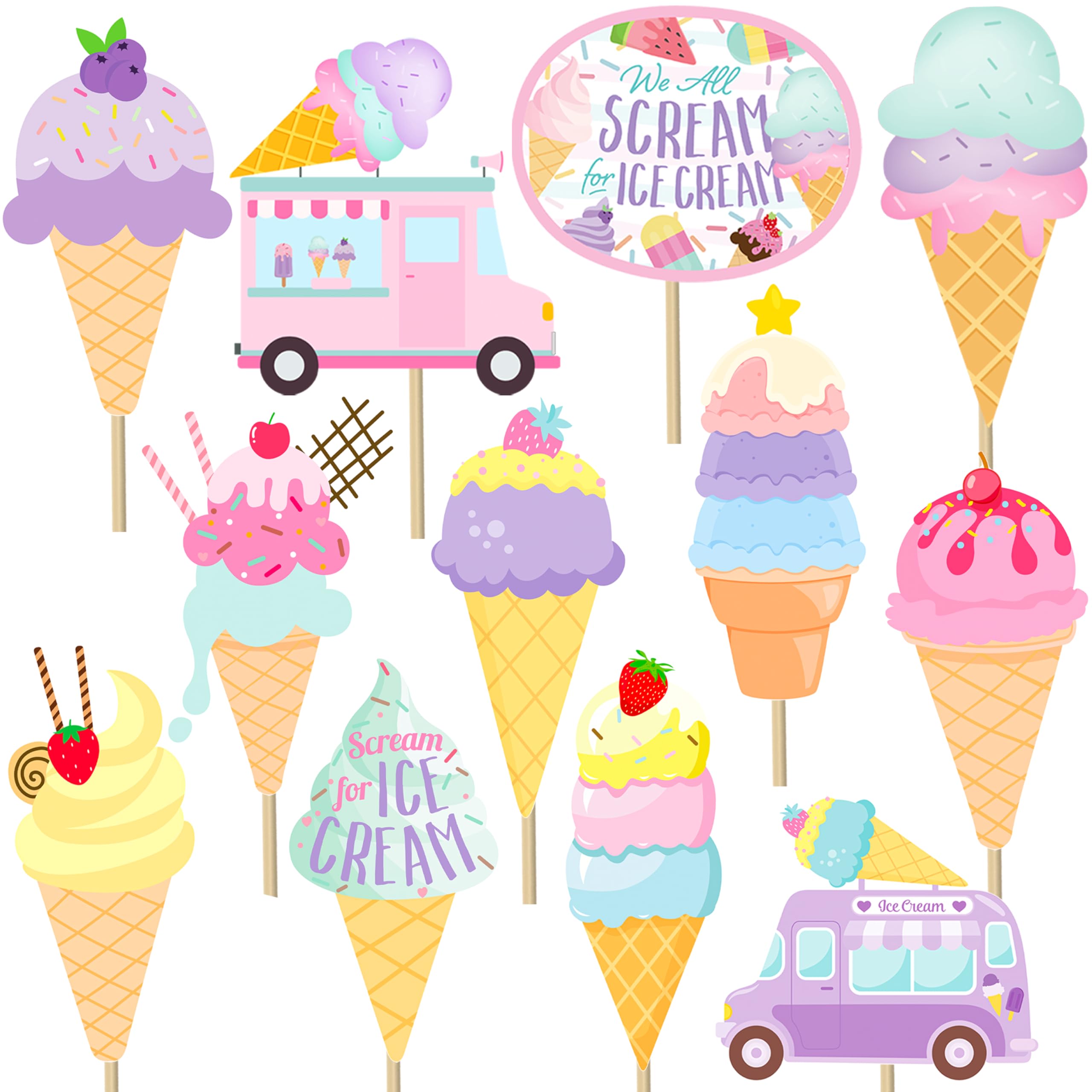 This set includes 26 charming pieces featuring adorable ice cream designs, ice cream trucks, and festive 'We All Scream for Ice Cream' signs. The kit comes with separate cards and sticks, plus stickers for easy DIY assembly, allowing you to create stunning table decorations that will make your guests smile. Each design showcases sweet pastel colors and playful illustrations, from triple-scoop cones to strawberry-topped sundaes. Perfect for birthday parties, summer celebrations, or any ice cream social gathering.