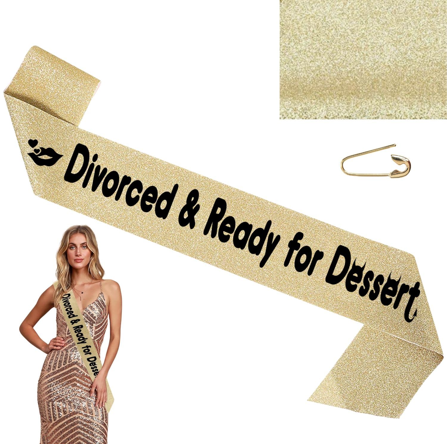- PACKAGE INCLUDES: 1 Divorced Sash and 1 Safety Pin. FEATURES: Gold glitter sash with black foil letters that read "Divorced & Ready for Dessert". SIZE: One size fits all (3.75 x 31.5 inches). Ideal divorce party decoration for the newly divorced.