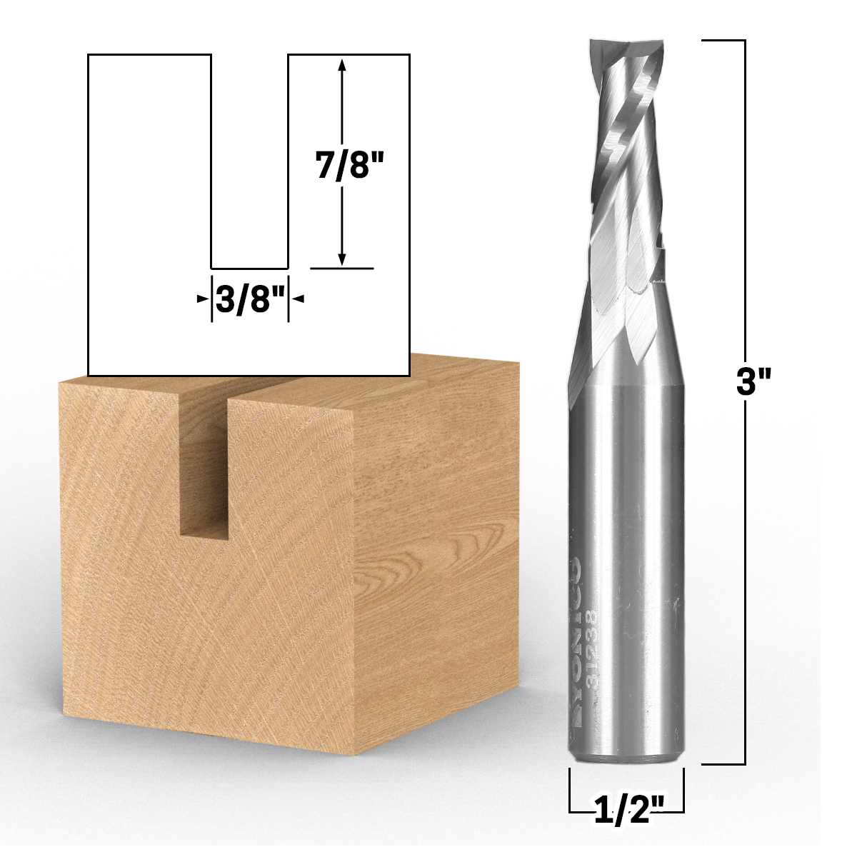 Best used for: Standard milling, dadoing, and boring.• Cutting Diameter: 3/8" • Cutting Height: 7/8" • Shank Diameter: 1/2" • Overall Length: 3" • Flutes: 2 Up-cut endmills direct woodchips up and away from the milling area leaving an unobstructed path for the endmill. Bit breakage is less likely. Up cut end mills are the best choice for most standard milling applications. The up cut direction can leave behind a minimally rough top surface edge.
