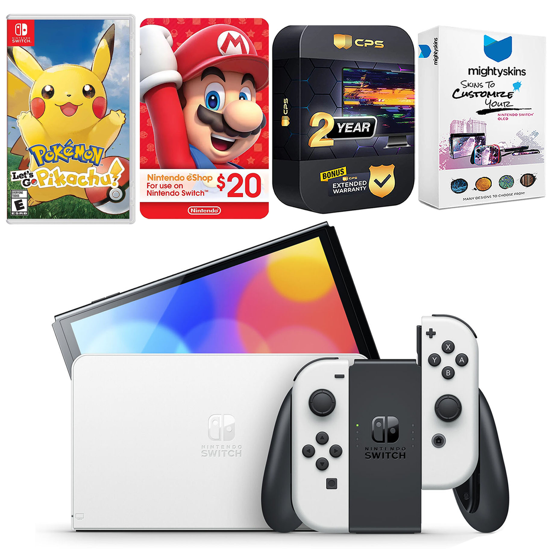 INCLUDED: Nintendo Switch OLED Console, Nintendo Switch OLED Dock, Left & Right Joy-Cons, Joy-Con Wrist Straps, Joy-Con Grip, High speed HDMI Cable, Nintendo Switch AC Adapter, Pokemon Let's Go, Pikachu!, Nintendo $20 eShop Gift Physical Card, MightySkins Voucher, and 2 Year CPS Extended Warranty