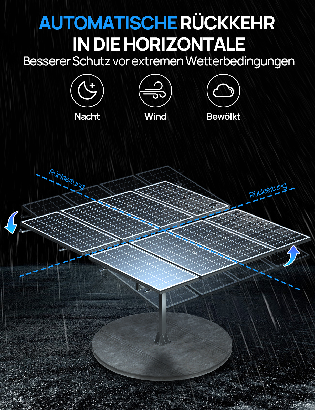 Automatische Nivellierung bei starkem Wind, um extremen Wetterbedingungen standzuhalten: Wenn die Windgeschwindigkeit 17,2 m/s (0,0107 mile/s) übersteigt, kann es automatisch nivelliert werden (einstellbar), und gleichzeitig kann die Richtung der Halterung manuell durch den Controller eingestellt werden, um den Oberflächenschnee des Panels an verschneiten Tagen intelligent zu entfernen.