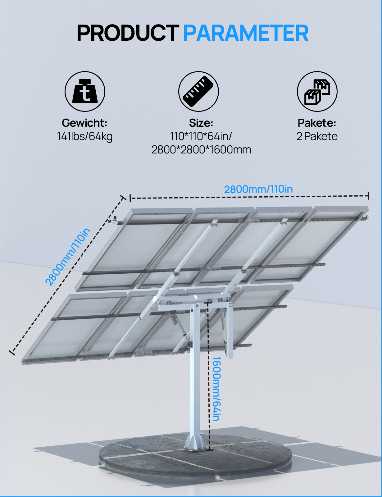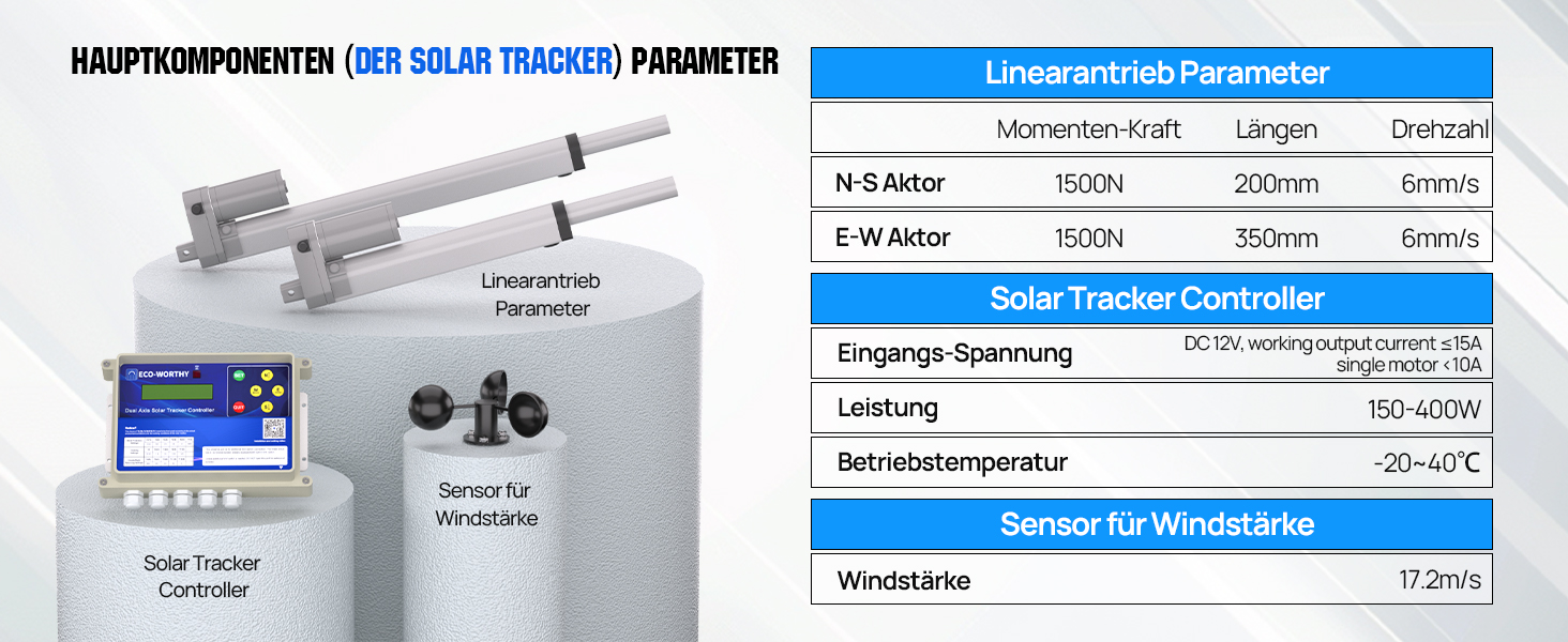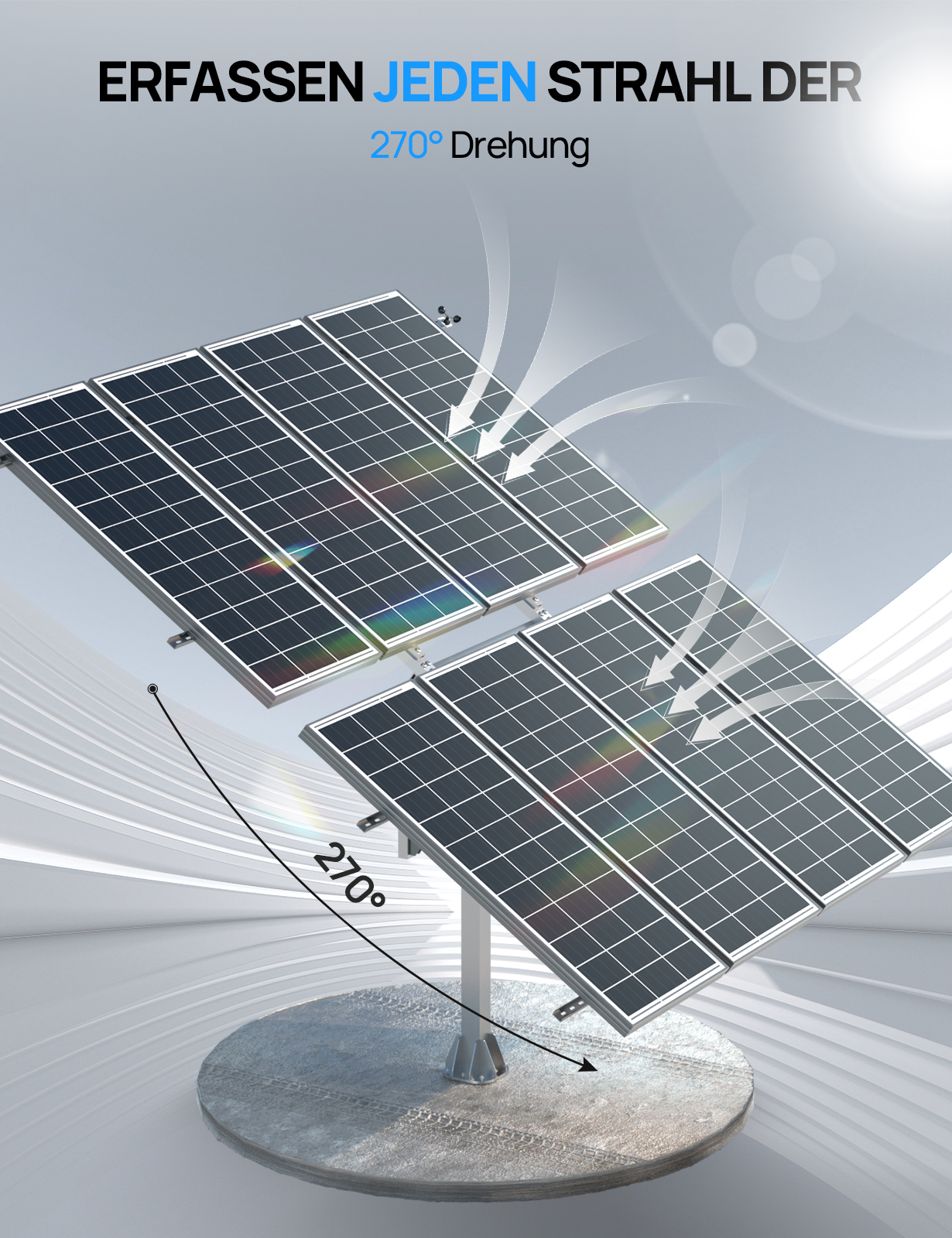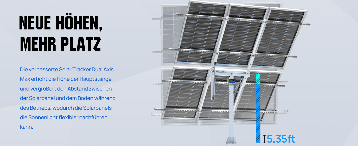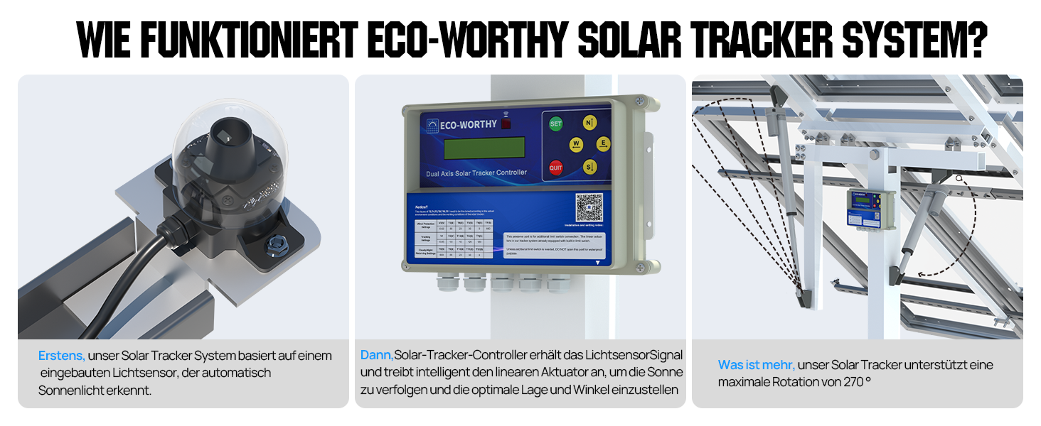 Erfassen Sie jeden Lichtstrahl und verlängern Sie die effektive Leuchtdauer: Der Solar Tracker kombiniert einen Zwei-Achsen-Antrieb und empfindliche Sensoren, um eine genaue 270°-Nachführung der Sonne zu realisieren, jeden Lichtstrahl zu erfassen und die effektive Beleuchtungszeit zu verlängern, um eine effiziente Energieumwandlung zu ermöglichen.