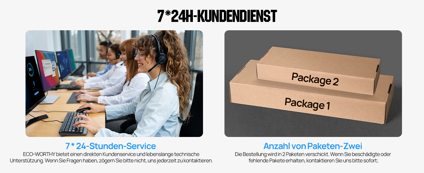 ECO-WORTHY hat sich verpflichtet, einen persönlichen Kundenservice und lebenslangen, sorgenfreien technischen Support zu bieten. Wann und wo auch immer Sie Fragen haben oder Hilfe benötigen, können Sie uns jederzeit kontaktieren, und wir werden uns freuen, Ihnen zu helfen.
