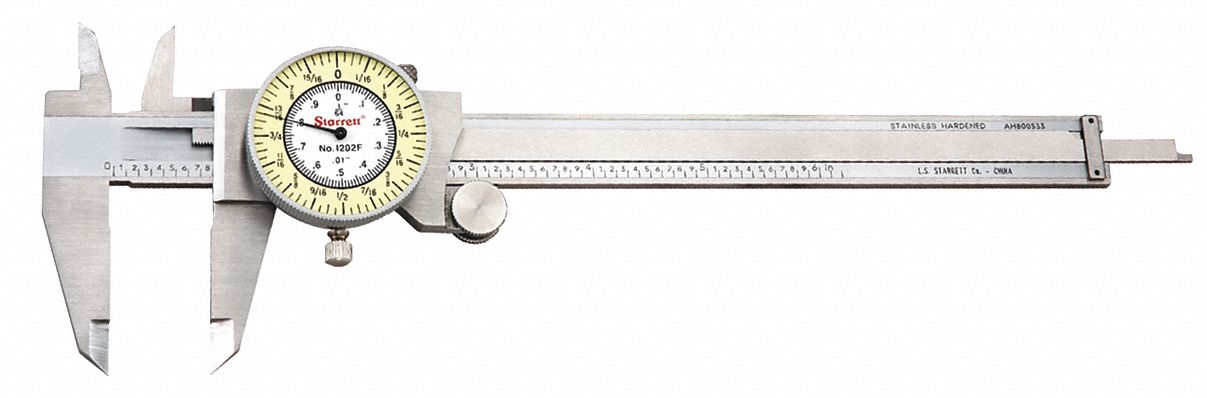 Fractional Inch Dial Caliper, Range 0 in to 6 in, Accuracy +/-0.002 in, Long Form Calibration Certificate No, Caliper Material Stainless Steel, Dial Color White (Decimal Inch - Inner), Yellow (Fractional Inch - Outer), Dial Graduation 0.01 in; 1/64 in, Dimension Type Inch/Fractional Inch, Jaw Actuation Type Thumb Wheel, Jaw Depth 1.5 in, Jaw Material Stainless Steel, Maximum Measurement - Inch 6 in, Measurements 4-Way, Measures Depth Yes, Measures Inside Dimension Yes Dial calipers measure I.D., O.D., depth, and steps. Stainless steel construction.