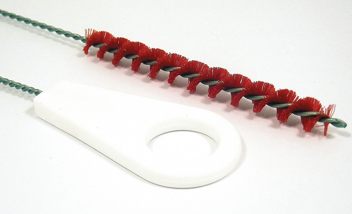 Pipe Brush, Handle Style Straight, Bristle Material Nylon, Handle Material Polypropylene, Brush Diameter 0.5 in, Brush Length 5 in, Handle Length 31 in, Bristle Color Red, Application Food Industry, Color Coding System Yes, FDA Compliant Yes, Features Single Spiral, Single Stem, Overall Length 36 in