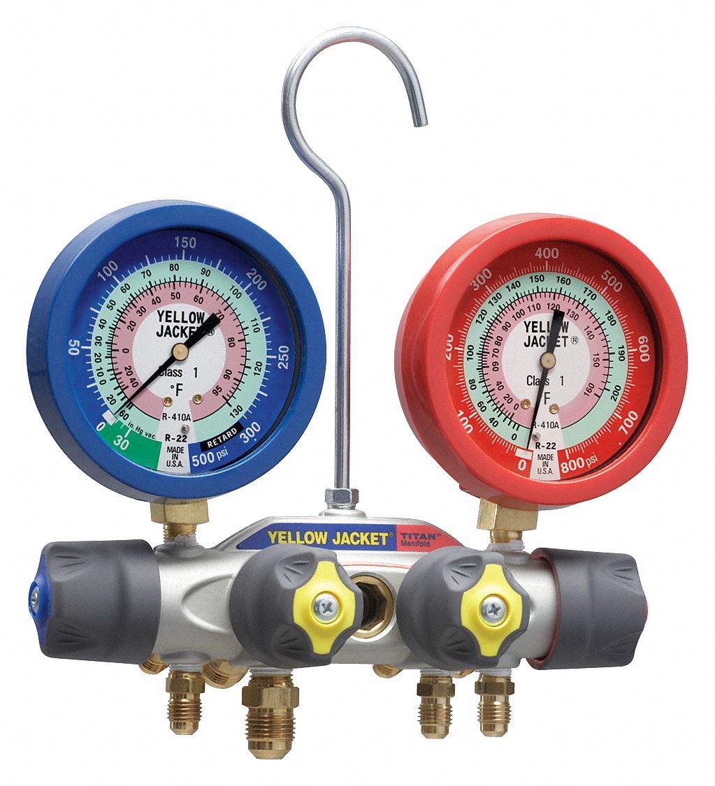 Manifold Gauge, Number of Valves 4, R-22, R-410A, Number of Hoses 0, Not Applicable, 0 to 800 psig, 30 in Hg to 350 psi, +/-1.00 Percent, 3/8 in, Forged Aluminum Alloy, Liquid Filled 1 Percent Accuracy, Includes Not Applicable