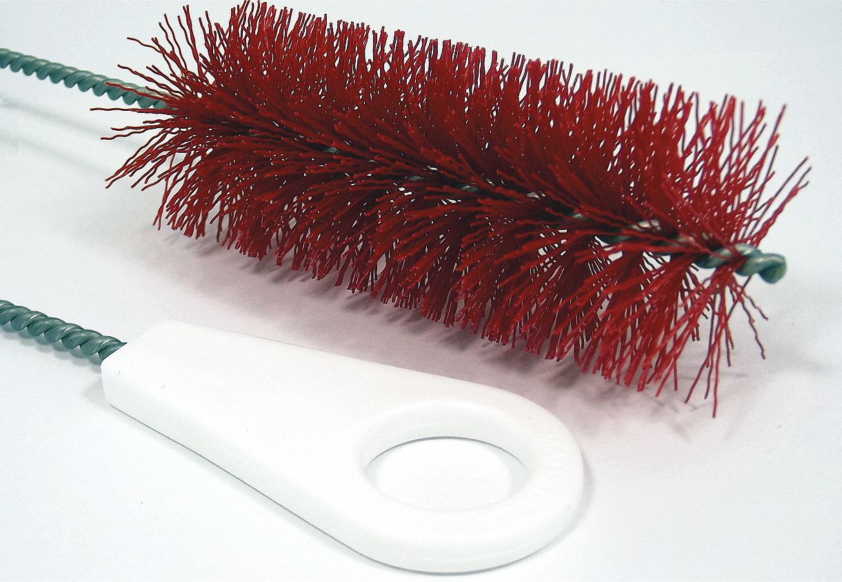 Pipe Brush, Handle Style Straight, Bristle Material Nylon, Handle Material Polypropylene, Brush Diameter 2 in, Brush Length 5 in, Handle Length 13 in, Bristle Color Red, Application Food Industry, Color Coding System Yes, FDA Compliant Yes, Features Single Spiral, Single Stem, Overall Length 18 in