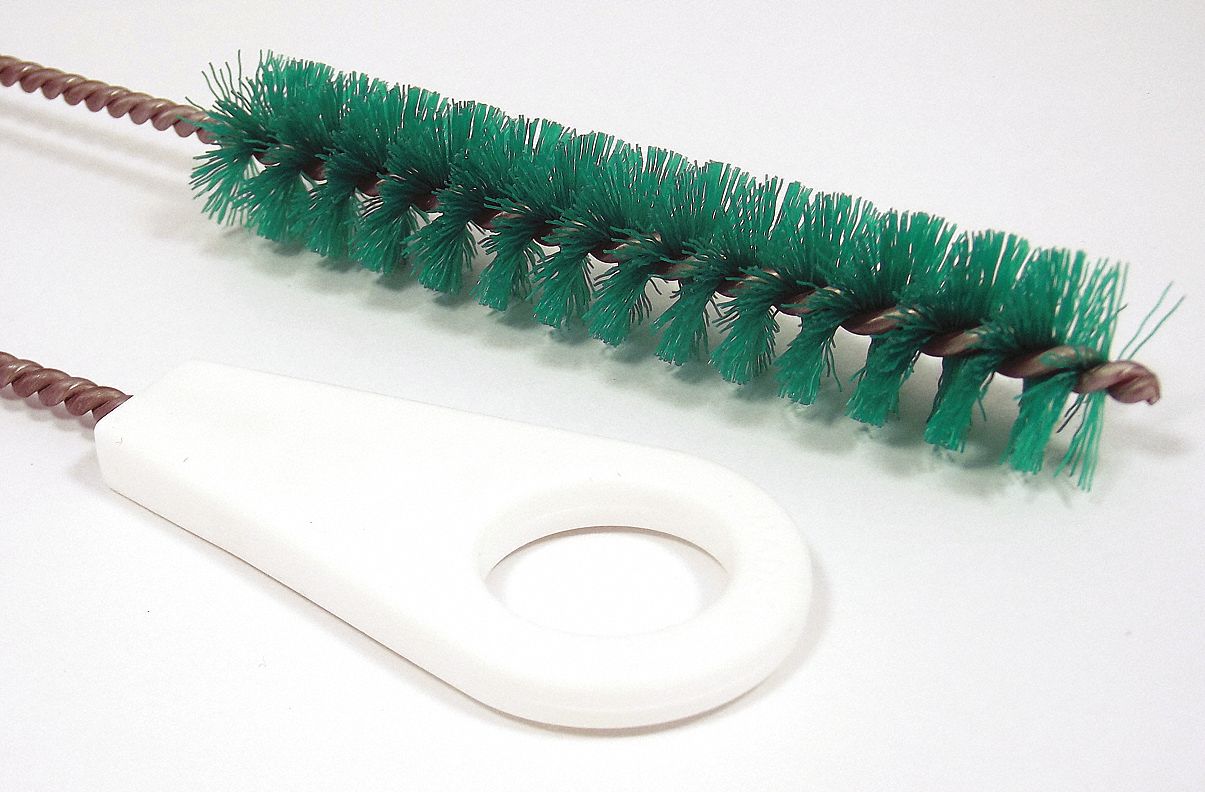 Pipe Brush, Handle Style Straight, Bristle Material Nylon, Handle Material Polypropylene, Brush Diameter 1 in, Brush Length 5 in, Handle Length 13 in, Bristle Color Green, Application Food Industry, Color Coding System Yes, FDA Compliant Yes, Features Single Spiral, Single Stem, Overall Length 18 in